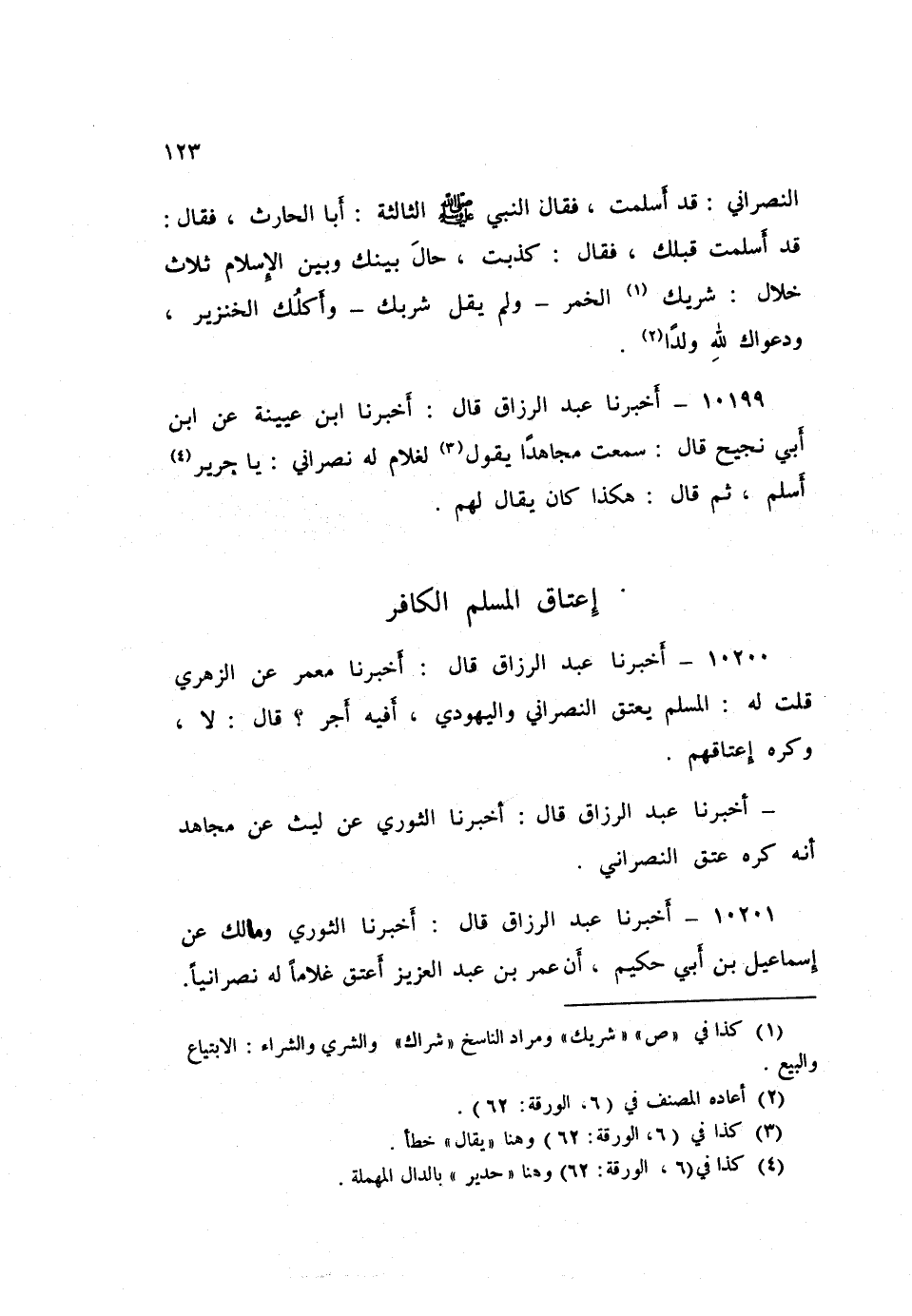 10201 - عَبْدُ الرَّزَّاقِ قَالَ: أَخْبَرَنَا الثَّوْرِيُّ، وَمَالِكٌ، عَنْ إِسْمَاعِيلَ بْنِ أَبِي حَكِيمٍ: أَنَّ عُمَرَ بْنَ عَبْدِ الْعَزِيزِ: «§أَعْتَقَ غُلَامًا لَهُ نَصْرَانِيًّا»