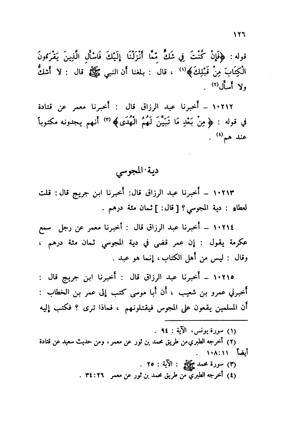 10216 - عَبْدُ الرَّزَّاقِ قَالَ: أَخْبَرَنَا مَعْمَرٌ، عَنْ قَتَادَةَ، عَنِ ابْنِ الْمُسَيِّبِ قَالَ: «§دِيَةُ الْمَجُوسِيِّ ثَمَانِ مِائَةِ دِرْهَمٍ». أَخْبَرَنَا