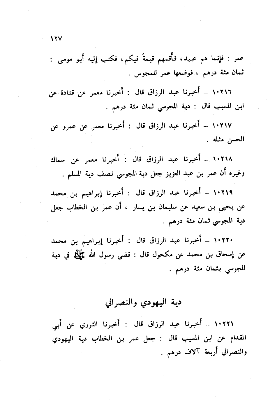 10221 - عَبْدُ الرَّزَّاقِ قَالَ: أَخْبَرَنَا الثَّوْرِيُّ، عَنْ أَبِي الْمِقْدَامِ، عَنِ ابْنِ الْمُسَيِّبِ قَالَ: «جَعَلَ عُمَرُ بْنُ الْخَطَّابِ §دِيَةَ الْيَهُودِيَّ وَالنَّصْرَانِيَّ أَرْبَعَةَ آلَافِ دِرْهَمٍ»