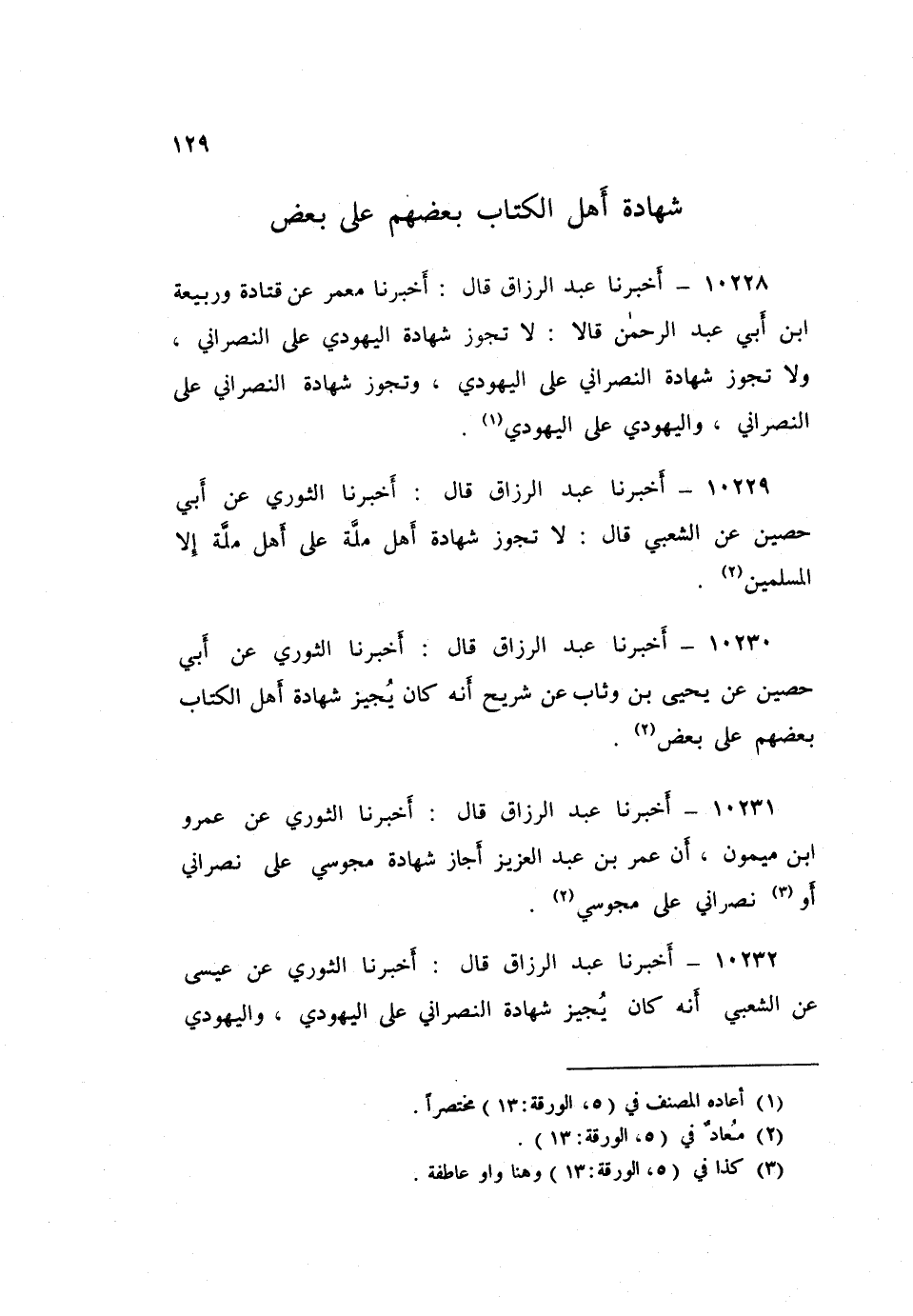 10229 - عَبْدُ الرَّزَّاقِ قَالَ: أَخْبَرَنَا الثَّوْرِيُّ، عَنْ أَبِي حَصِينٍ، عَنِ الشَّعْبِيِّ قَالَ: «§لَا تَجُوزُ شَهَادَةُ أَهْلِ مِلَّةٍ عَلَى أَهْلِ مِلَّةٍ إِلَّا الْمُسْلِمِينَ»