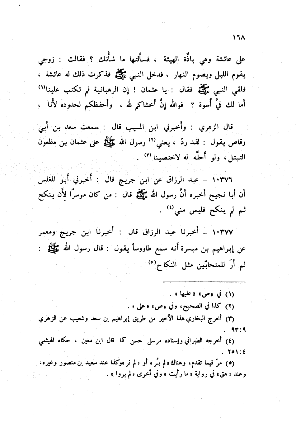 قَالَ الزُّهْرِيُّ: وَأَخْبَرَنِي ابْنُ الْمُسَيِّبِ قَالَ: سَمِعْتُ سَعْدَ بْنَ أَبِي وَقَّاصٍ يَقُولُ: «لَقَدْ §رَدَّ، يَعْنِي رَسُولُ اللَّهِ صَلَّى اللهُ عَلَيْهِ وَسَلَّمَ عَلَى عُثْمَانَ بْنِ مَظْعُونٍ التَّبَتُّلَ، وَلَوْ أَحَلَّهُ لَهُ لِاخْتَصَيْنَا»