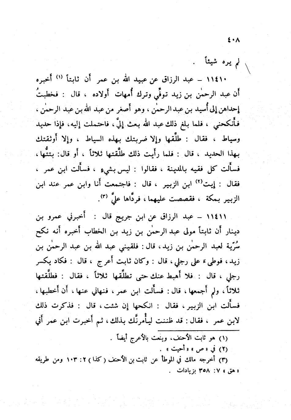 11411 - عَبْد ُ الرَّزَّاقِ، عَنْ جُرَيْجٍ قَالَ: أَخْبَرَنِي عَمْرُو بْنُ دِينَارٍ، أَنَّ ثَابِتًا مَوْلَى عَبْدِ الرَّحْمَنِ بْنِ زَيْدِ بْنِ الْخَطَّابِ أَخْبَرَهُ: أَنَّهُ نَكَحَ سُرِّيَّةً لِعَبْدِ الرَّحْمَنِ بْنِ زَيْدٍ قَالَ: فَلَقِيَنِي عَبْدُ اللَّهِ بْنُ عَبْدِ الرَّحْمَنِ بْنِ زَيْدٍ فَوَطِئَ عَلَى رِجْلِي قَالَ: وَكَانَ ثَابِتٌ أَعْرَجَ قَالَ: فَكَادَ يَكْسِرُ رِجْلِي قَالَ: §فَلَا أَهْبِطُ عَنْكَ حَتَّى تُطَلِّقَهَا ثَلَاثًا، فَقَالَ: فَطَلَّقْتُهَا ثَلَاثًا، وَلَمْ أَجْمَعْهَا قَالَ: فَسَأَلْتُ ابْنَ عُمَرَ فَنَهَانِي عَنْهَا أَنْ أَخْطِبَهَا، فَسَأَلْتُ ابْنَ الزُّبَيْرِ، فَقَالَ: «انْكَحْهَا إِنْ شِئْتَ» قَالَ: فَذَكَرْتُ ذَلِكَ لَابْنِ عُمَرَ، فَقَالَ: قَدْ ظَنَنْتُ لَيَأَمُرَنَّكَ بِذَلِكَ، ثُمَّ أَخْبَرْتُ ابْنَ عُمَرَ أَنِّي لَمْ أَجْمَعْهَا، فَقَالَ: انْكَحْهَا إِنْ شِئْتَ "