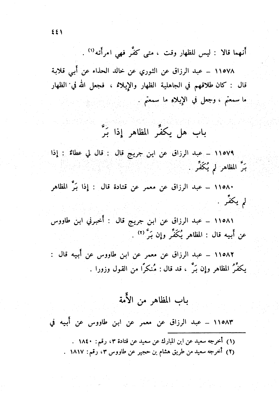 11581 - عَنِ ابْنِ جُرَيْجٍ قَالَ: أَخْبَرَنِي ابْنُ طَاوُسٍ، عَنْ أَبِيهِ قَالَ: «§الْمُظَاهِرُ يُكَفِّرُ وَإِنْ بَرَّ»