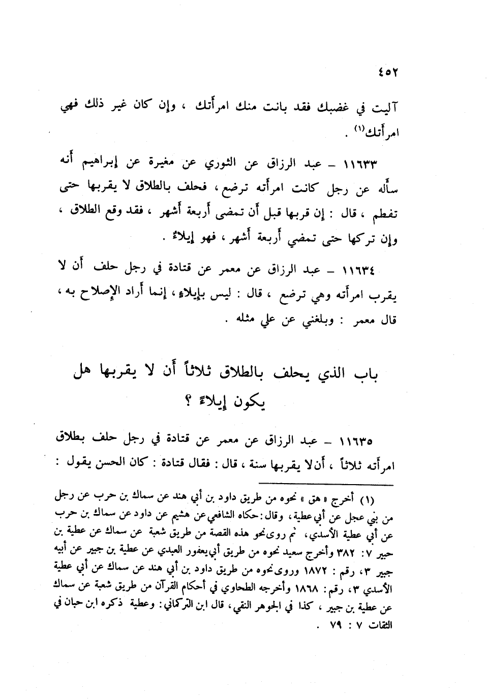 11635 - عَنْ مَعْمَرٍ، عَنْ قَتَادَةَ: فِي رَجُلٍ حَلَفَ بِطَلَاقِ امْرَأَتِهِ ثَلَاثًا أَنْ لَا يَقْرَبَهَا سَنَةً قَالَ: فَقَالَ قَتَادَةُ: كَانَ الْحَسَنُ يَقُولُ: «§إِذَا مَضَتِ الْأَشْهُرُ فَقَدْ بَانَتْ مِنْهُ، فَإِنْ تَزَوَّجَهَا بَعْدَ ذَلِكَ فَلَيْسَ عَلَيْهِ إِيلَاءٌ، قَدْ هَدَمَهُ الطَّلَاقُ وَالنِّكَاحُ». قَالَ: قُلْتُ: أَدِّهِ، قَالَ أَبُو الشَّعْثَاءِ: «إِذَا مَضَتِ الْأَشْهُرُ فَقَدْ بَانَتْ مِنْهُ، فَإِنْ تَزَوَّجَهَا بَعْدَ ذَلِكَ فَلَيْسَ عَلَيْهِ إِيلَاءٌ، وَلَكِنَّهُ لَا يَقْرَبُهَا حَتَّى تَمْضِيَ السَّنَةُ، فَإِنْ مَسَّهَا حَنِثَ فِي يَمِينِهِ»، قَالَ مَعْمَرٌ: وَبَلَغَنِي عَنْ إِبْرَاهِيمَ أَنَّهُ قَالَ: «إِنْ تَزَوَّجَهَا بَعْدَ ذَلِكَ فَقَدْ وَقَعَ الْإِيلَاءُ»