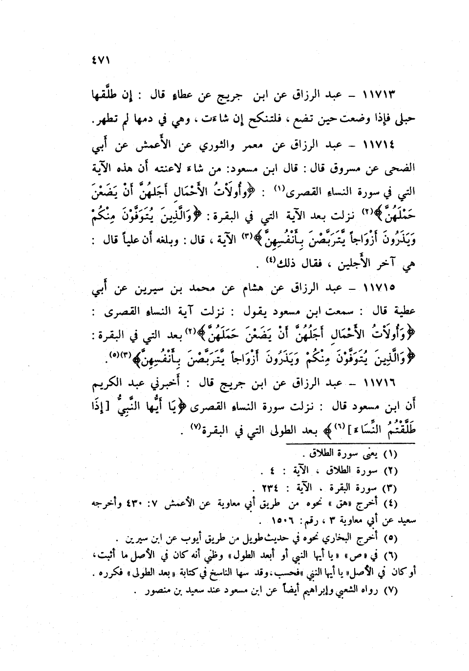 11716 - عَنِ ابْنِ جُرَيْجٍ قَالَ: أَخْبَرَنِي عَبْدُ الْكَرِيمِ، أَنَّ ابْنَ مَسْعُودٍ قَالَ: " §نَزَلَتْ سُوَرَةُ النِّسَاءِ الْقُصْرَى: {يَا أَيُّهَا النَّبِيُّ إِذَا طَلَّقْتُمُ النِّسَاءَ} [الطلاق: 1] بَعْدَ الطُّولَى الَّتِي فِي الْبَقَرَةِ "