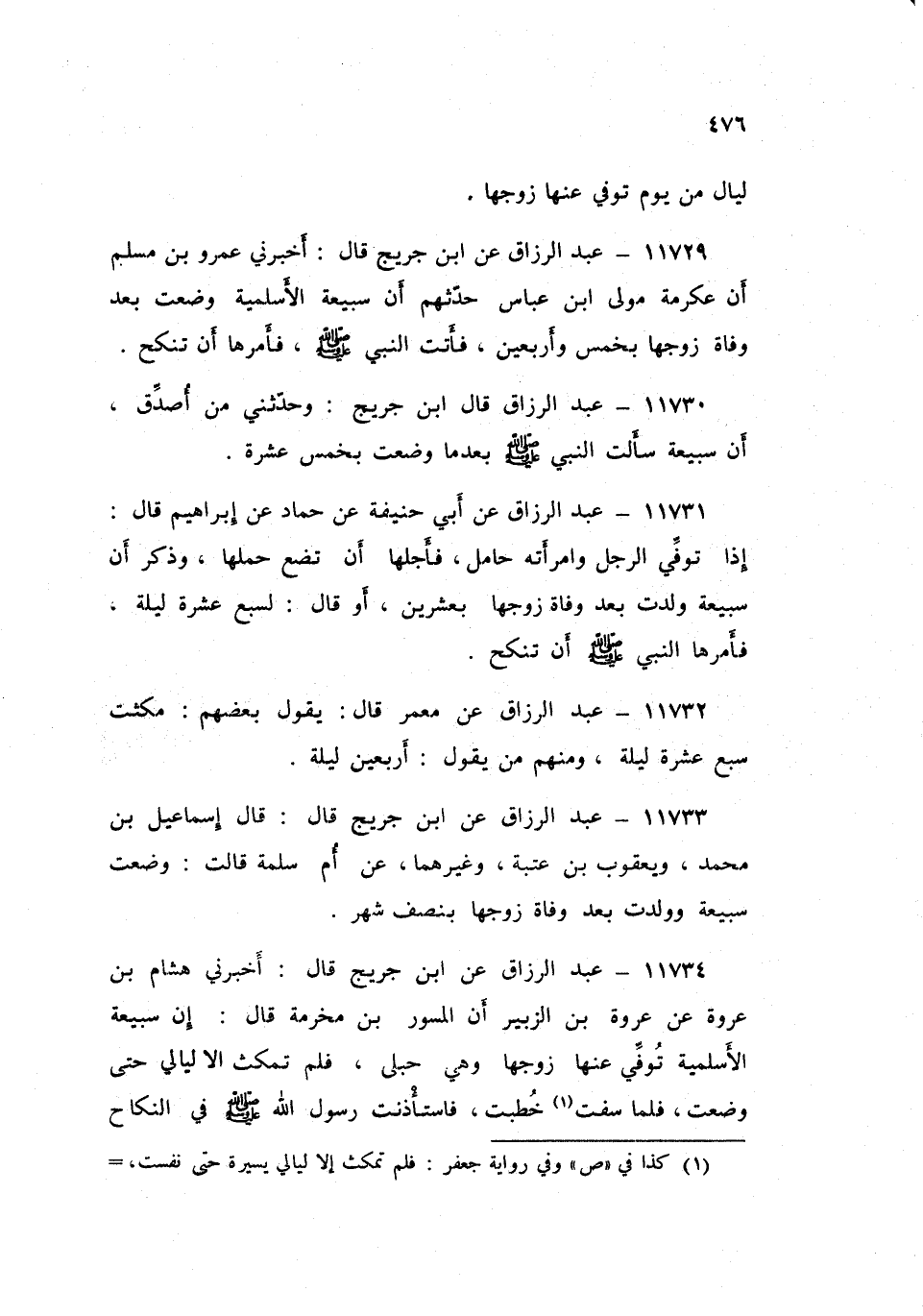 11733 - عَنِ ابْنِ جُرَيْجٍ قَالَ: قَالَ إِسْمَاعِيلُ بْنُ مُحَمَّدٍ، وَيَعْقُوبُ بْنُ عُتْبَةَ وَغَيْرُهُمَا، عَنْ أُمِّ سَلَمَةَ قَالَتْ: «§وَضَعَتْ سُبَيْعَةُ وَوَلَدَتْ بَعْدَ وَفَاةِ زَوْجِهَا بِنِصْفِ شَهْرٍ»