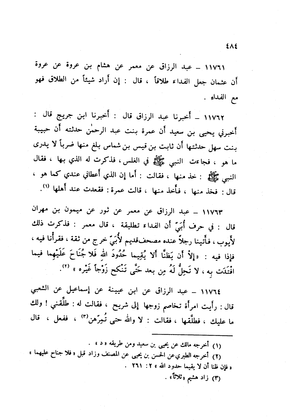 11763 - عَنْ مَعْمَرٍ، عَنْ ثَوْرٍ، عَنْ مَيْمُونِ بْنِ مِهْرَانَ، قَالَ فِي حَرْفِ أُبَيٍّ: «أَنَّ §الْفِدَاءَ تَطْلِيقَةٌ»، قَالَ مَعْمَرٌ: فَذَكَرْتُ ذَلِكَ لِأَيُّوبَ، فَأَتَيْنَا رَجُلًا عِنْدَهُ مُصْحَفٌ قَدِيمٌ لِأُبَيٍّ خَرَجَ مِنْ ثِقَةٍ، فَقَرَأْنَا فِيهِ، فَإِذَا فِيهِ: «إِلَّا أَنْ يَظُنَّا أَلَّا يُقِيمَا حُدُودَ اللَّهِ فَلَا جُنَاحَ عَلَيْهِمَا فِيمَا افْتَدَتْ بِهِ لَا تَحِلُّ لَهُ مِنْ بَعْدُ حَتَّى تَنْكِحَ زَوْجًا غَيْرَهُ»
