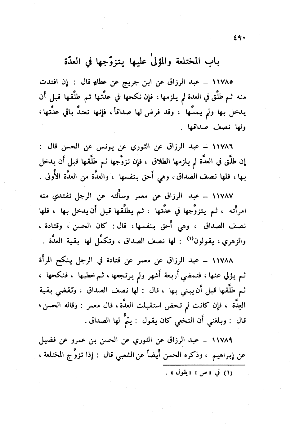 11787 - عَنْ مَعْمَرٍ، وَسَأَلْتُهُ عَنِ الرَّجُلِ تَفْتَدِي مِنْهُ امْرَأَتُهُ ثُمَّ يَتَزَوَّجُهَا فِي عِدَّتِهَا، ثُمَّ يُطَلِّقُهَا قَبْلَ أَنْ يَدْخُلَ بِهَا: «§فَلَهَا نِصْفُ الصَّدَاقِ، وَهِيَ أَحَقُّ بِنَفْسِهَا». قَالَ: كَانَ الْحَسَنُ، وَقَتَادَةُ، وَالزُّهْرِيُّ، يَقُولُونَ: «لَهَا نِصْفُ الصَّدَاقِ، وَتُكْمِلُ لَهَا بَقِيَّةَ الْعِدَّةِ»