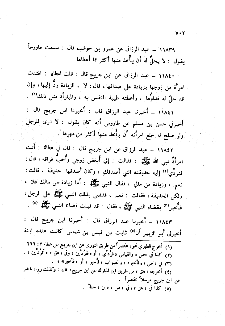 11843 - عَبْدُ الرَّزَّاقِ قَالَ: أَخْبَرَنَا ابْنُ جُرَيْجٍ قَالَ: أَخْبَرَنِي أَبُو الزُّبَيْرٍ: أَنَّ ثَابِتَ بْنَ قَيْسِ بْنِ شَمَّاسٍ كَانَتْ عِنْدَهُ ابْنَةُ عَبْدِ اللَّهِ بْنِ سَلُولٍ، وَكَانَ أَصْدَقَهَا حَدِيقَةً فَكَرِهَتْهُ، فَقَالَ النَّبِيُّ صَلَّى اللهُ عَلَيْهِ وَسَلَّمَ: «§تَرُدِّينَ عَلَيْهِ حَدِيقَتَهُ الَّتِي أَعْطَاكِ؟» قَالَتْ: نَعَمْ، فَأَخَذَهَا، وَخَلَّى سَبِيلَهَا، فَلَمَّا بَلَغَ ذَلِكَ ثَابِتَ بْنَ قَيْسٍ قَالَ: قَدْ قَبِلْتُ قَضَاءَ رَسُولِ اللَّهِ صَلَّى اللهُ عَلَيْهِ وَسَلَّمَ ". سَمِعَهُ أَبُو الزُّبَيْرِ مِنْ غَيْرِ وَاحِدٍ
