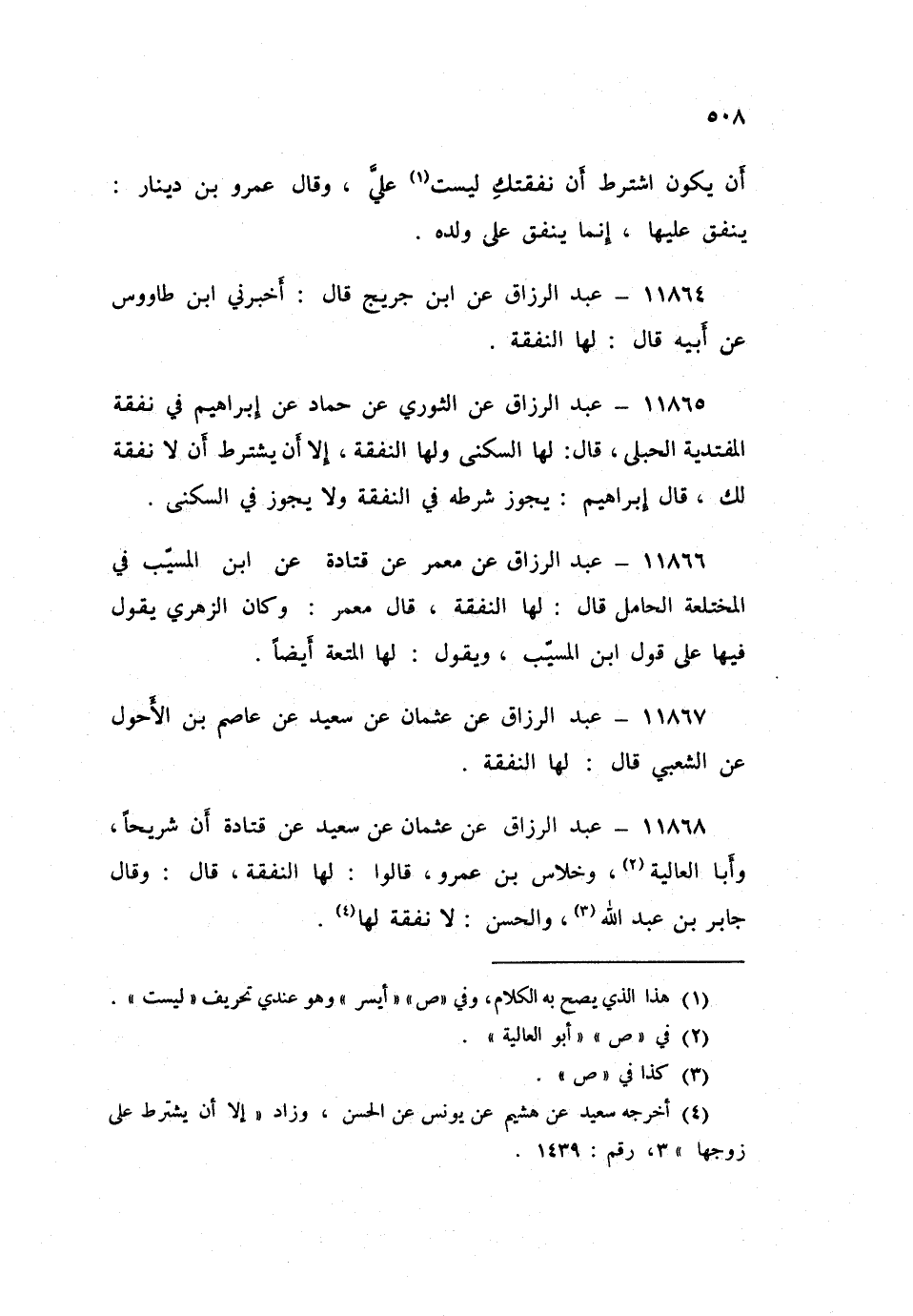 11865 - عَنِ الثَّوْرِيِّ، عَنْ حَمَّادٍ، عَنْ إِبْرَاهِيمَ فِي نَفَقَةِ الْمُفْتَدِيَةِ الْحُبْلَى قَالَ: «§لَهَا السُّكْنَى، وَلَهَا النَّفَقَةُ إِلَّا أَنْ يَشْتَرِطَ أَنْ لَا نَفَقَةَ لَكِ»، قَالَ إِبْرَاهِيمُ: «يَجُوزُ شَرْطُهُ فِي النَّفَقَةِ، وَلَا يَجُوزُ فِي السُّكْنَى»