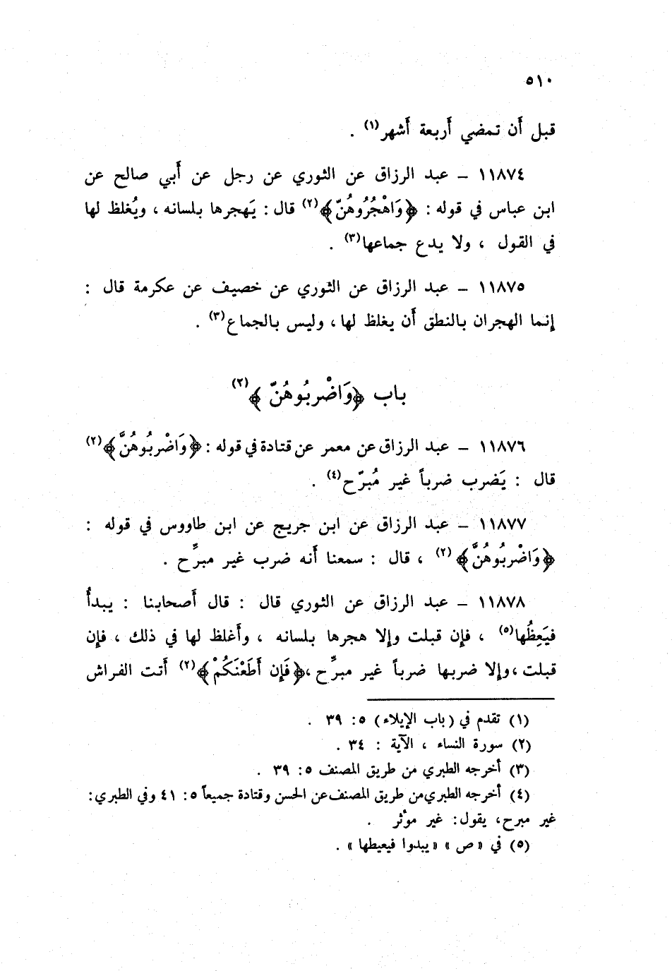 11876 - عَنْ مَعْمَرٍ، عَنْ قَتَادَةَ فِي قَوْلِهِ {وَاضْرِبُوهُنَّ} [النساء: 34] قَالَ: «§يَضْرِبُ ضَرْبًا غَيْرَ مُبَرِّحٍ»