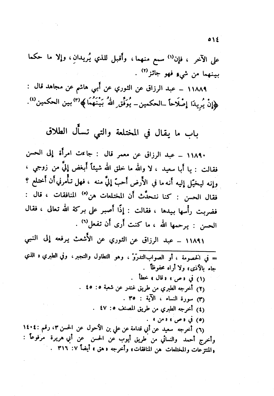 11890 - عَنْ مَعْمَرٍ قَالَ: جَاءَتِ امْرَأَةٌ إِلَى الْحَسَنِ، فَقَالَتْ: يَا أَبَا سَعِيدٍ لَا وَاللَّهِ مَا خَلَقَ اللَّهُ شَيْئًا أَبْغَضَ إِلَيَّ مِنْ زَوْجِي، وَإِنَّهُ لَيُخَيَّلُ إِلَيْهِ أَنَّهُ مَا فِي الْأَرْضِ أَحَبُّ إِلَيَّ مِنْهُ، فَهَلْ تَأْمُرُنِي أَنْ أَخْتَلِعَ؟ فَقَالَ الْحَسَنُ: «كُنَّا نَتَحَدَّثُ أَنَّ §الْمُخْتَلِعَاتِ هُنَّ الْمُنَافِقَاتُ» قَالَ: فَضَرَبَتْ رَأْسَهَا بِيَدِهَا، فَقَالَتْ: إِذًا أَصْبِرُ عَلَى بَرَكَةِ اللَّهِ تَعَالَى، فَقَالَ الْحَسَنُ: «يَرْحَمُهَا اللَّهُ مَا كُنْتُ أَرَى أَنْ تَفْعَلَ»