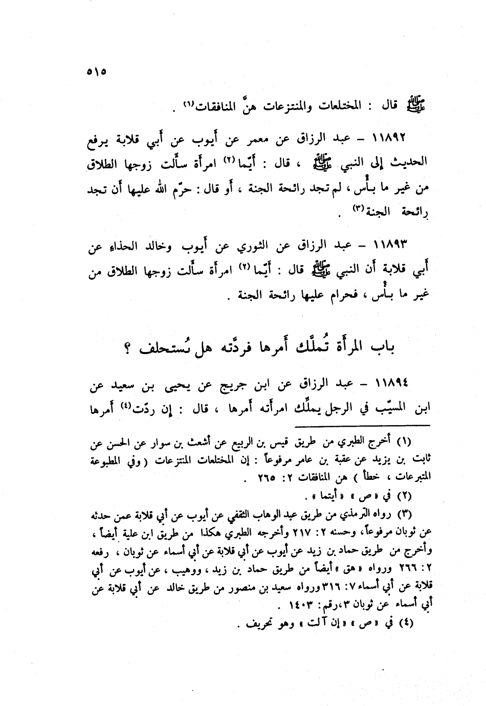 11893 - عَنِ الثَّوْرِيِّ، عَنْ أَيُّوبَ، وَخَالِدٍ الْحَذَّاءَ، عَنْ أَبِي قِلَابَةَ: أَنَّ النَّبِيَّ صَلَّى اللهُ عَلَيْهِ وَسَلَّمَ قَالَ: «§أَيُّمَا امْرَأَةٍ سَأَلَتْ زَوْجَهَا الطَّلَاقَ مِنْ غَيْرِ مَا بَأْسٍ فَحَرَامٌ عَلَيْهَا رَائِحَةُ الْجَنَّةِ»