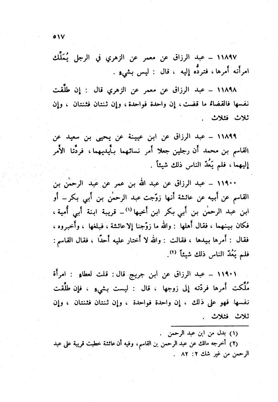 11899 - عَنِ ابْنِ عُيَيْنَةَ، عَنْ يَحْيَى بْنِ سَعِيدٍ، عَنِ الْقَاسِمِ بْنِ مُحَمَّدٍ: «§أَنَّ رَجُلَيْنِ جَعَلَا أَمْرَ نِسَائِهِمَا بِأَيْدِيهِمَا فَرَدَّتَا الْأَمْرَ إِلَيْهِمَا فَلَمْ يَعُدَّ النَّاسُ ذَلِكَ شَيْئًا»
