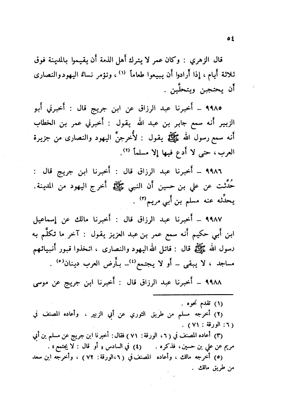 9986 - عَبْدُ الرَّزَّاقِ قَالَ: أَخْبَرَنَا ابْنُ جُرَيْجٍ قَالَ: حُدِّثْتُ، عَنْ عَلِيِّ بْنِ حُسَيْنٍ: «أَنَّ النَّبِيَّ صَلَّى اللهُ عَلَيْهِ وَسَلَّمَ §أَخْرَجَ الْيَهُودَ مِنَ الْمَدِينَةِ». يُحَدِّثُهُ عَنْهُ مُسْلِمُ بْنُ أَبِي مَرْيَمَ