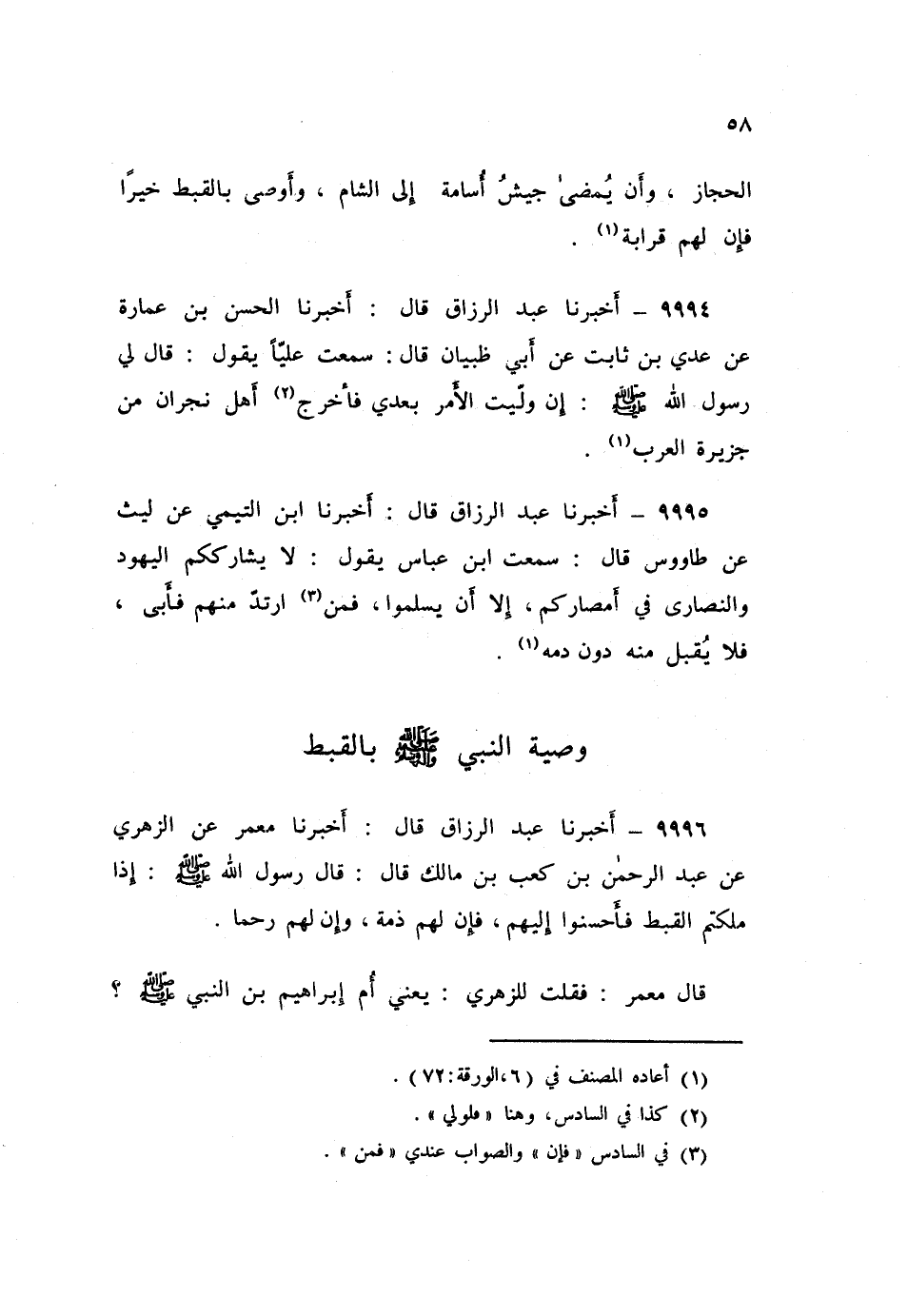 9996 - عَبْدُ الرَّزَّاقِ قَالَ: أَخْبَرَنَا مَعْمَرٌ، عَنِ الزُّهْرِيِّ، عَنْ عَبْدِ الرَّحْمَنِ بْنِ كَعْبِ بْنِ مَالِكٍ قَالَ: قَالَ رَسُولُ اللَّهِ صَلَّى اللهُ عَلَيْهِ وَسَلَّمَ: «§إِذَا مَلَكْتُمُ الْقِبْطَ فَأَحْسِنُوا إِلَيْهِمْ، فَإِنَّ لَهُمْ ذِمَّةً، وَإِنَّ لَهُمْ رَحِمًا». قَالَ مَعْمَرٌ: فَقُلْتُ لِلزُّهْرِيِّ: يَعْنِي أُمَّ إِبْرَاهِيمَ ابْنِ النَّبِيِّ صَلَّى اللهُ عَلَيْهِ وَسَلَّمَ قَالَ: بَلْ أُمَّ إِسْمَاعِيلَ. أَخْبَرَنَا