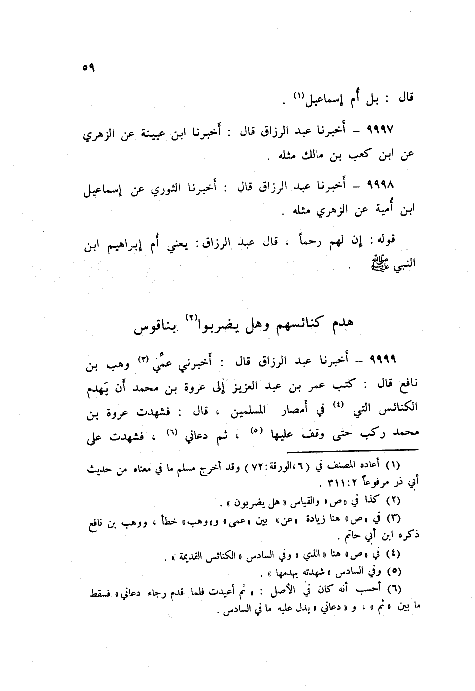 9999 - عَبْدُ الرَّزَّاقِ قَالَ: أَخْبَرَنِي عَمِّي وَهْبُ بْنُ نَافِعٍ قَالَ: كَتَبَ عُمَرُ بْنُ عَبْدِ الْعَزِيزِ إِلَى عُرْوَةَ بْنِ مُحَمَّدٍ: «أَنْ §يَهْدِمَ الْكَنَائِسَ الَّتِي فِي أَمْصَارِ الْمُسْلِمِينَ» قَالَ: فَشَهِدْتُ عُرْوَةَ بْنَ مُحَمَّدٍ رَكِبَ حَتَّى وَقَفَ عَلَيْهَا، ثُمَّ دَعَانِي فَشَهِدْتُ عَلَى كِتَابِ عُمَرَ، وَهَدَمَ عُرْوَةُ إِيَّاهَا فَهَدَمَهَا
