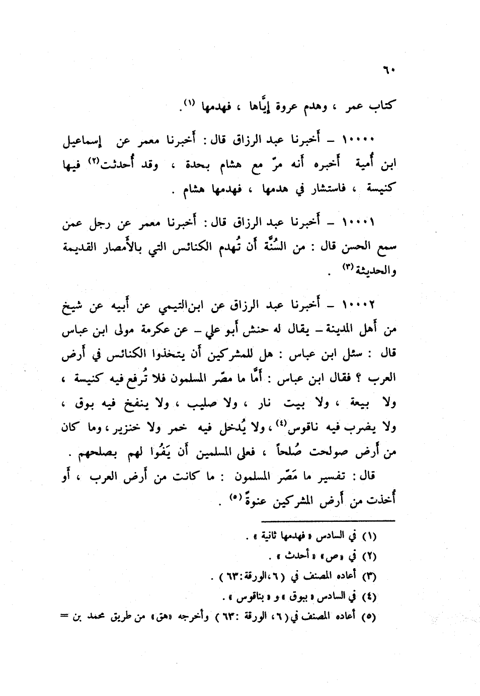 10001 - عَبْدُ الرَّزَّاقِ قَالَ: أَخْبَرَنَا مَعْمَرٌ، عَنْ رَجُلٍ، عَمَّنَ، سَمِعَ الْحَسَنَ قَالَ: «§مِنَ السُّنَّةِ أَنْ تُهْدَمَ الْكَنَائِسُ الَّتِي بِالْأَمْصَارِ الْقَدِيمَةُ وَالْحَدِيثَةُ»