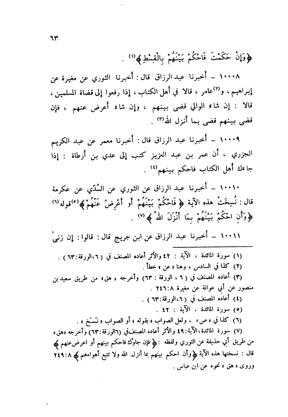 10009 - عَبْدُ الرَّزَّاقِ قَالَ: أَخْبَرَنَا مَعْمَرٌ، عَنْ عَبْدِ الْكَرِيمِ الْجَزَرِيِّ، أَنَّ عُمَرَ بْنَ عَبْدِ الْعَزِيزِ، كَتَبَ إِلَى عَدِيِّ بْنِ أَرْطَأَةَ: «§إِذَا جَاءَكَ أَهْلُ الْكِتَابِ فَاحْكُمْ بَيْنَهُمْ»