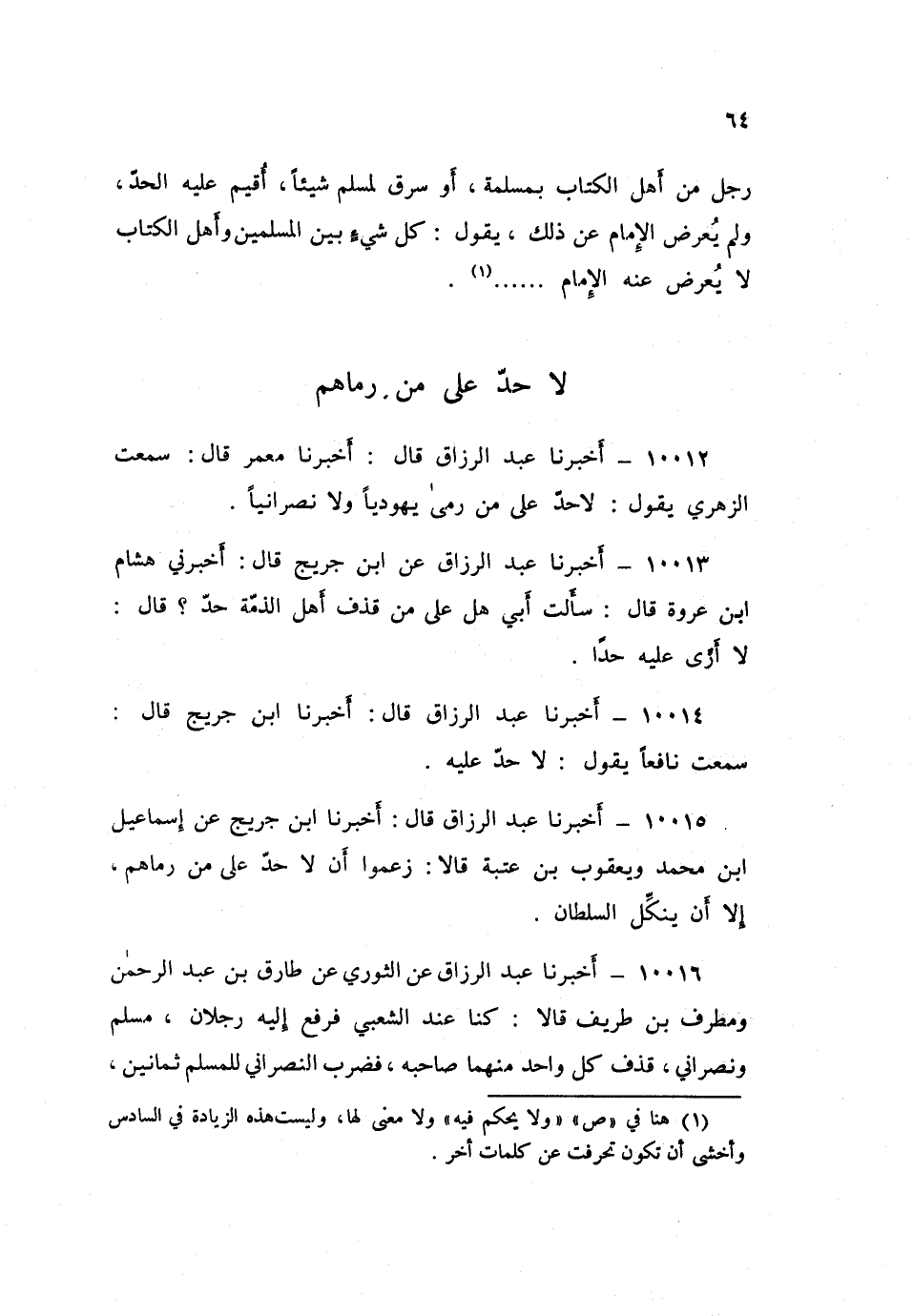 10012 - عَبْدُ الرَّزَّاقِ قَالَ: أَخْبَرَنَا مَعْمَرٌ قَالَ: سَمِعْتُ الزُّهْرِيَّ يَقُولُ: «§لَا حَدَّ عَلَى مَنْ رَمَى يَهُودِيًّا وَلَا نَصْرَانِيًّا»