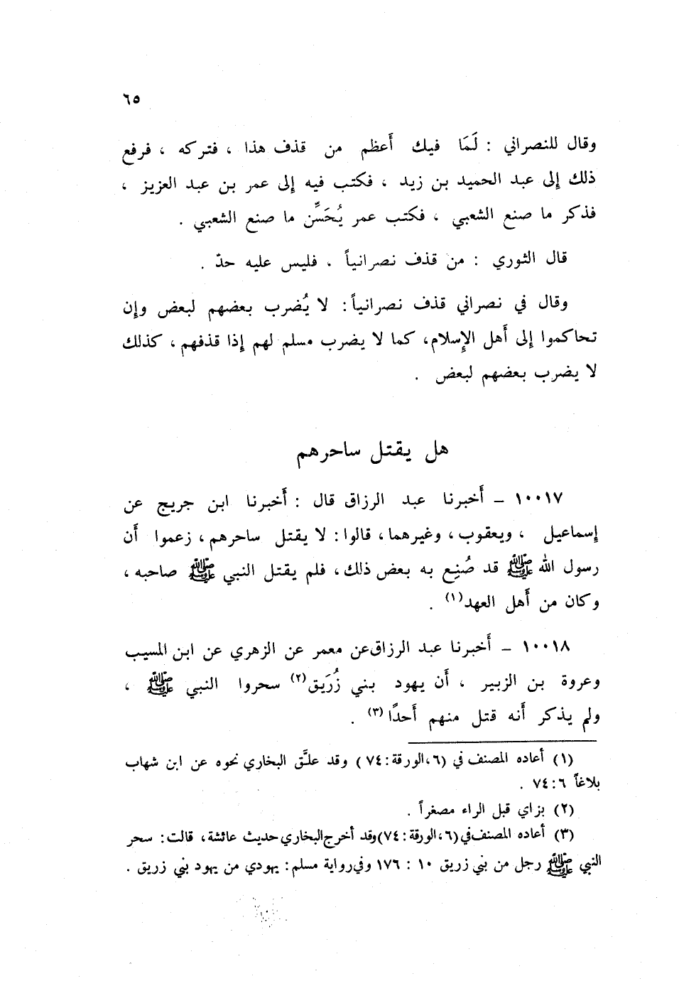 10018 - أَخْبَرَنَا عَبْدُ الرَّزَّاقِ قَالَ: عَنْ مَعْمَرٍ، عَنِ الزُّهْرِيِّ، عَنِ ابْنِ الْمُسَيِّبِ، وَعُرْوَةَ بْنِ الزُّبَيْرِ: «أَنَّ §يَهُودَ بَنِي زُرَيْقٍ سَحَرُوا النَّبِيَّ صَلَّى اللهُ عَلَيْهِ وَسَلَّمَ، وَلَمْ يُذْكَرْ أَنَّهُ قَتَلَ مِنْهُمْ أَحَدًا»