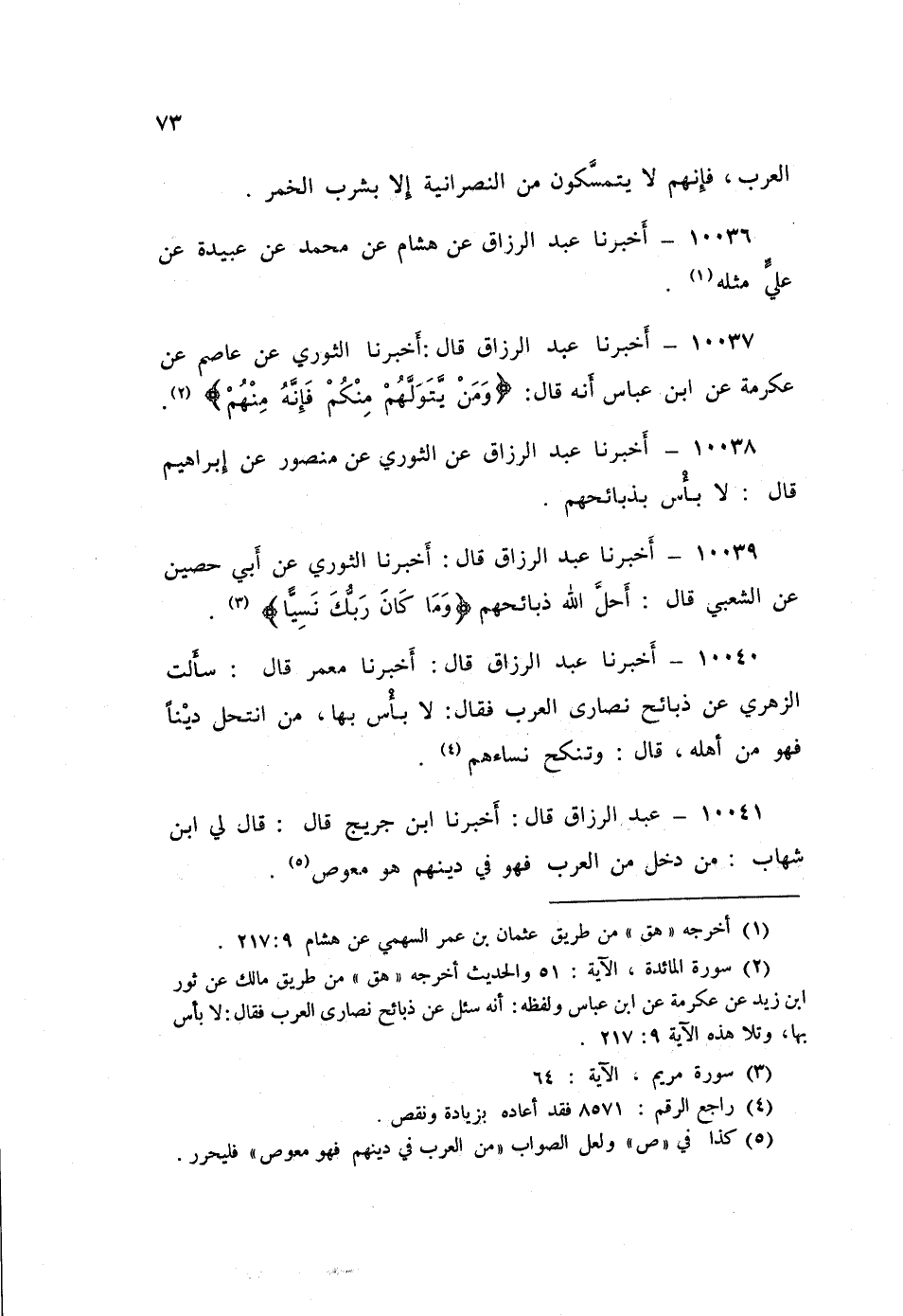 10040 - عَبْدُ الرَّزَّاقِ قَالَ: أَخْبَرَنَا مَعْمَرٌ قَالَ: سَأَلْتُ الزُّهْرِيَّ، عَنْ ذَبَائِحِ نَصَارَى الْعَرَبِ، فَقَالَ: «لَا بَأْسَ بِهَا، §مَنِ انْتَحَلَ دِينًا فَهُوَ مِنْ أَهْلِهِ»