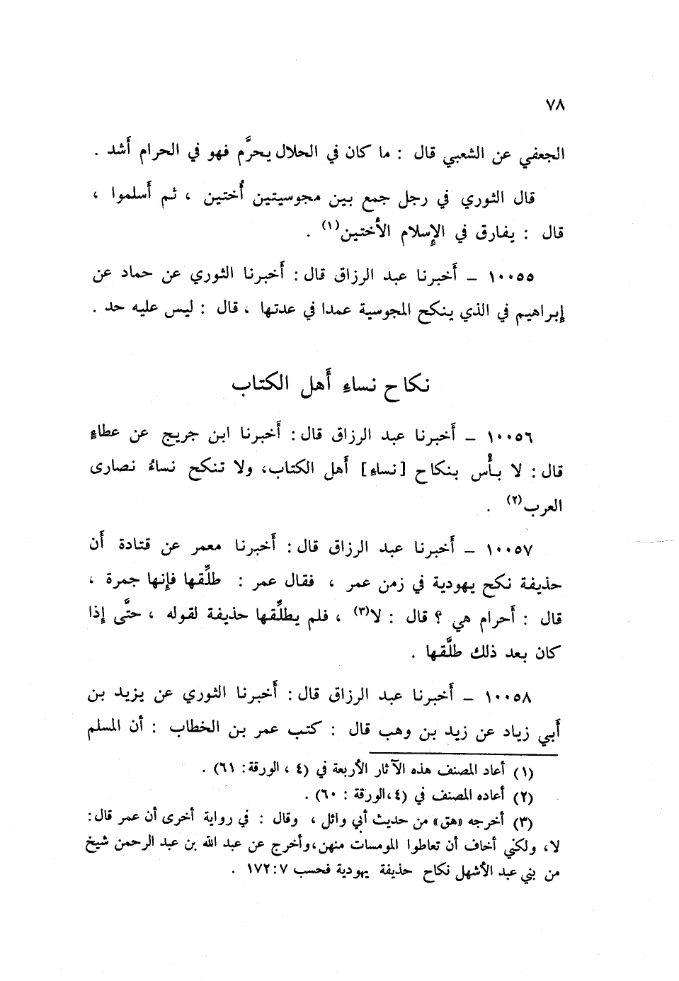 10059 - عَبْدُ الرَّزَّاقِ قَالَ: أَخْبَرَنَا ابْنُ جُرَيْجٍ قَالَ: أَخْبَرَنِي عَامِرُ بْنُ عَبْدِ الرَّحْمَنِ بْنِ نِسْطَاسٍ، أَنَّ طَلْحَةَ بْنَ عُبَيْدِ اللَّهِ نَكَحَ بِنْتَ عَظِيمِ الْيَهُودِ قَالَ: «§فَعَزَمَ عَلَيْهِ عُمَرُ إِلَّا مَا طَلَّقَهَا»