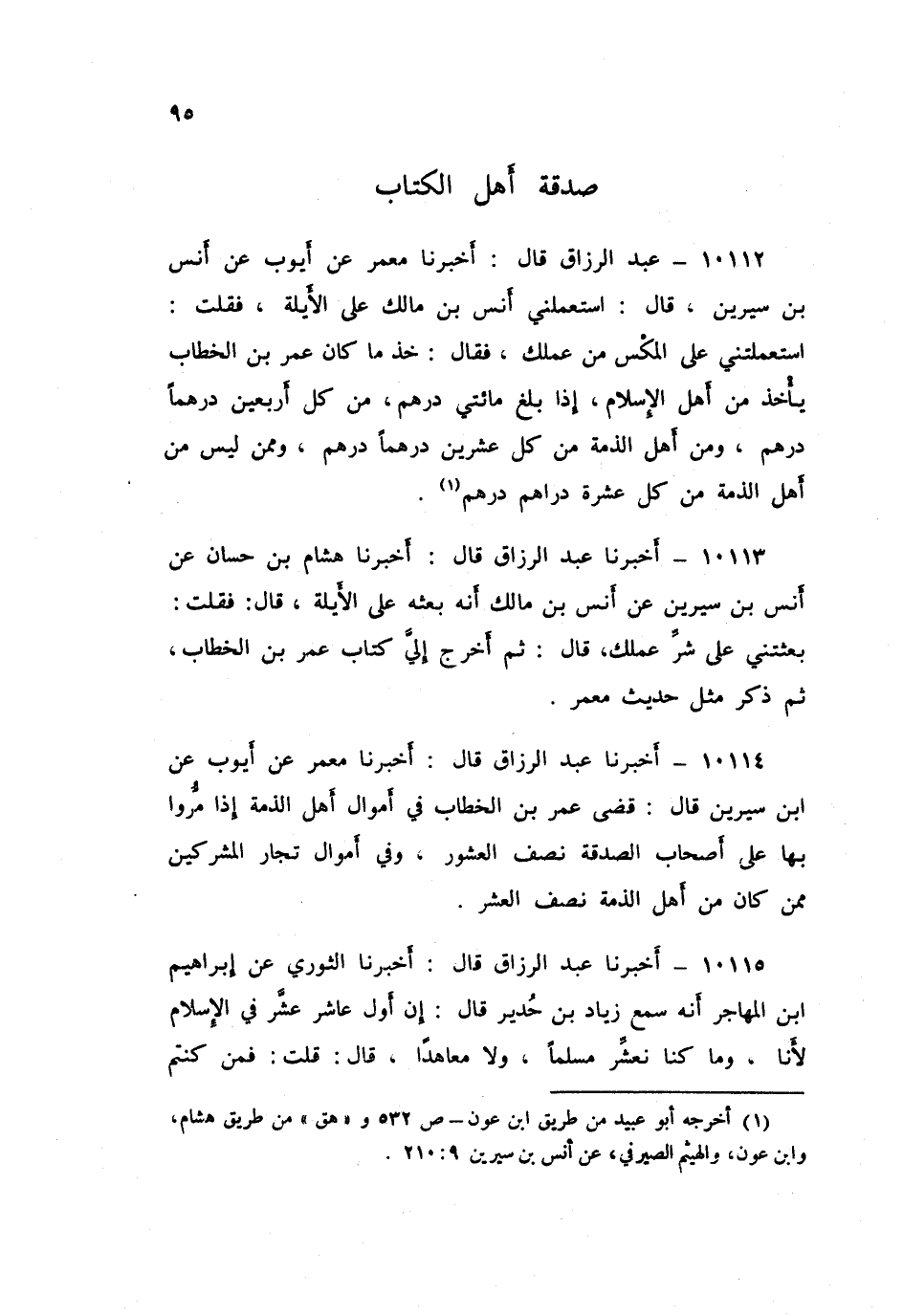 10114 - عَبْدُ الرَّزَّاقِ قَالَ: أَخْبَرَنَا مَعْمَرٌ، عَنْ أَيُّوبَ، عَنِ ابْنِ سِيرِينَ قَالَ: «§قَضَى عُمَرُ بْنُ الْخَطَّابِ فِي أَمْوَالِ أَهْلِ الذِّمَّةِ، إِذَا مَرُّوا بِهَا عَلَى أَصْحَابِ الصَّدَقَةِ نِصْفَ الْعُشُورِ، وَفِي أَمْوَالِ تُجَّارِ الْمُشْرِكِينَ مِمَّنْ كَانَ مِنْ أَهْلِ الذِّمَّةِ نِصْفَ الْعُشْرِ»