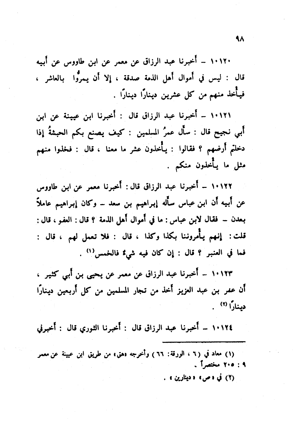 10120 - أَخْبَرَنَا عَبْدُ الرَّزَّاقِ قَالَ: عَنْ مَعْمَرٍ، عَنِ ابْنِ طَاوُسٍ، عَنْ أَبِيهِ قَالَ: «§لَيْسَ فِي أَمْوَالِ أَهْلِ الذِّمَّةِ صَدَقَةٌ إِلَّا أَنْ يَمُرُّوا بِالْعَاشِرِ فَيَأْخُذُ مِنْهُمْ مِنْ كُلِّ عِشْرِينَ دِينَارًا دِينَارًا»