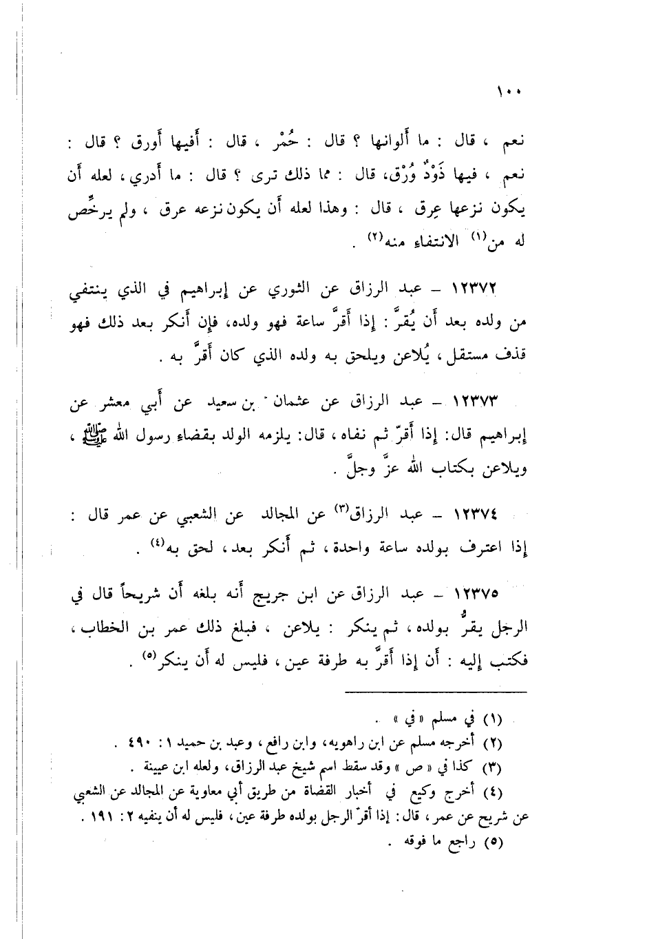 12376 - عَنِ ابْنِ عُيَيْنَةَ، عَنِ الْمُجَالِدِ، عَنِ الشَّعْبِيِّ قَالَ: «§إِذَا اعْتَرَفَ الرَّجُلُ بِوَلَدِهِ، ثُمَّ انْتَفَى مِنْهُ فَلَيْسَ ذَلِكَ لَهُ يُلْحَقُ بِهِ، وَإِنْ كَرِهَ». وَقَالَ عَامِرٌ: رَأَيْتُ شُرَيْحًا فَعَلَ ذَلِكَ بِرَجُلٍ مِنْ كِنْدَةَ أَقَرَّ بِوَلَدِهِ، ثُمَّ نَفَاهُ فَأَلْحَقَهُ بِهِ، ثُمَّ الْتَفَتَ إِلَيْنَا فَقَالَ: «لَوْ كَانَ هَذَا هَكَذَا لَأَوْشَكَ أَحَدُكُمْ أَنْ يَنْتَفِيَ وَلَدَهُ»