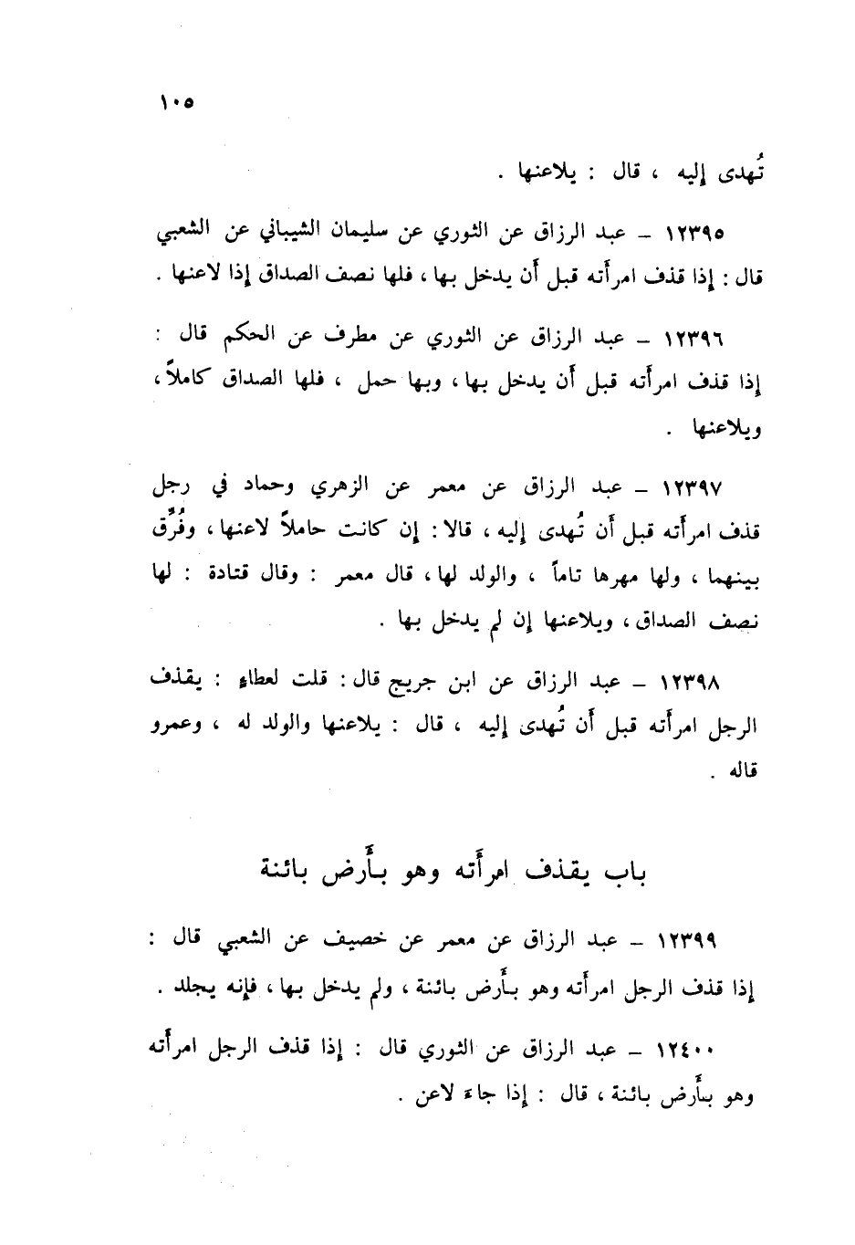 12399 - عَنْ مَعْمَرٍ، عَنْ خُصَيْفٍ، عَنِ الشَّعْبِيِّ قَالَ: «§إِذَا قَذَفَ الرَّجُلُ امْرَأَتَهُ وَهُوَ بِأَرْضٍ بَائِنَةٍ، وَلَمْ يَدْخُلْ بِهَا فَإِنَّهُ يُجْلَدُ»