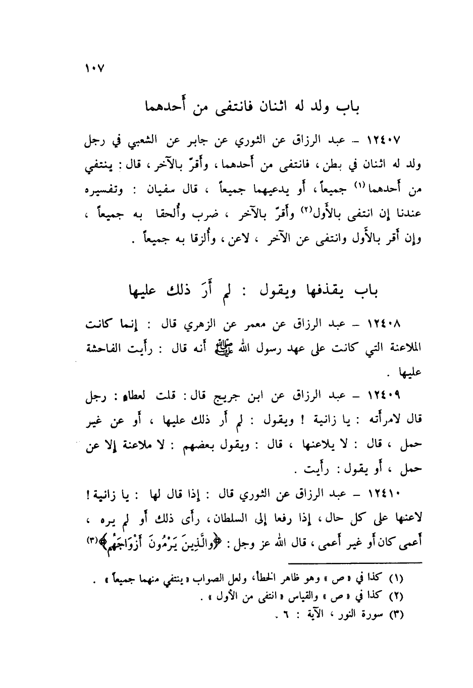 12407 - عَنِ الثَّوْرِيِّ، عَنْ جَابِرٍ، عَنِ الشَّعْبِيِّ فِي رَجُلٍ وُلِدَ لَهُ اثْنَانِ فِي بَطْنٍ، فَانْتَفَى مِنْ أَحَدِهِمَا، وَأَقَرَّ بِالْآخَرِ قَالَ: «§يَنْتَفِي مِنْ أَحَدِهِمَا جَمِيعًا، أَوْ يَدَّعِيهُمَا جَمِيعًا». قَالَ سُفْيَانُ: وَتَفْسِيرُهُ عِنْدَنَا: إِنِ انْتَفَى بِالْأَوَّلِ، وَأَقَرَّ بِالْآخَرِ، ضُرِبَ وَأُلْحِقَا بِهِ جَمِيعًا، وَإِنْ أَقَرَّ بِالْأَوَّلِ، وَانْتَفَى عَنِ الْآخَرِ لَاعَنَ وَأُلْزِقَا بِهِ جَمِيعًا "