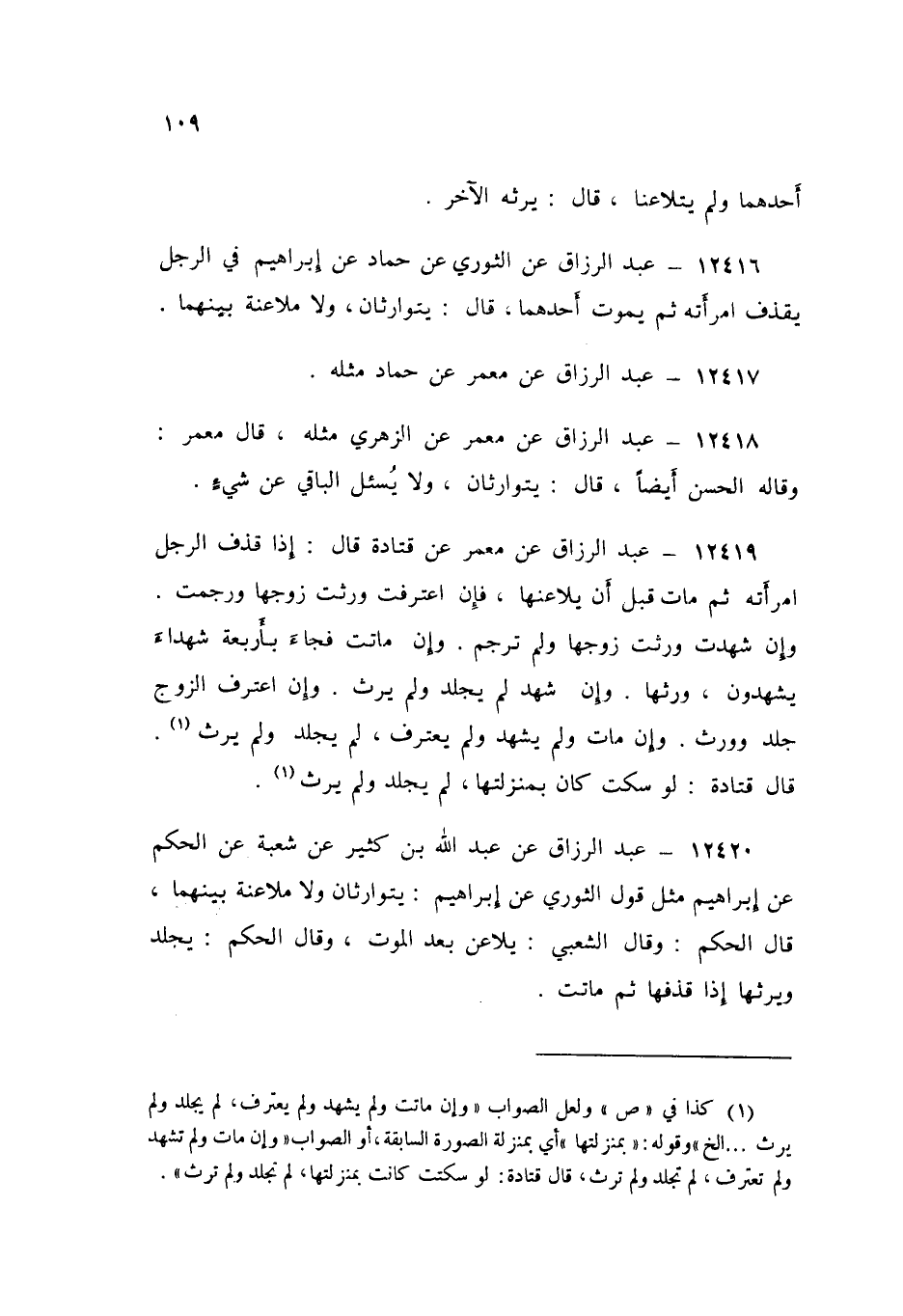 12420 - عَنْ عَبْدِ اللَّهِ بْنِ كَثِيرٍ، عَنْ شُعْبَةَ، عَنِ الْحَكَمِ، عَنْ إِبْرَاهِيمَ، مِثْلَ قَوْلِ الثَّوْرِيِّ. عَنْ إِبْرَاهِيمَ، «§يَتَوَارَثَانِ، وَلَا مُلَاعَنَةَ بَيْنَهُمَا». قَالَ الْحَكَمُ: وَقَالَ الشَّعْبِيُّ: «يُلَاعِنُ بَعْدَ الْمَوْتِ». وَقَالَ الْحَكَمُ: «يُجْلَدُ، وَيَرِثُهَا، إِذَا قَذَفَهَا، ثُمَّ مَاتَتْ»