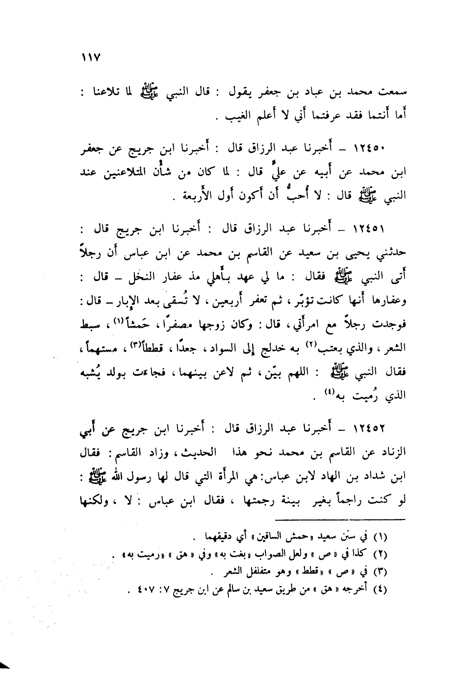 12452 - عَبْدُ الرَّزَّاقِ، أَخْبَرَنَا ابْنُ جُرَيْجٍ، عَنْ أَبِي الزِّنَادِ، عَنِ الْقَاسِمِ بْنِ مُحَمَّدٍ نَحْوَ هَذَا الْحَدِيثِ. وَزَادَ الْقَاسِمُ، فَقَالَ ابْنُ شَدَّادِ بْنِ الْهَادِ لِابْنِ عَبَّاسٍ: هِيَ الْمَرْأَةُ الَّتِي قَالَ لَهَا رَسُولُ اللَّهِ صَلَّى اللهُ عَلَيْهِ وَسَلَّمَ: «لَوْ كُنْتُ رَاجِمًا بِغَيْرِ بَيِّنَةٍ رَجَمْتُهَا» فَقَالَ ابْنُ عَبَّاسٍ: لَا وَلَكِنَّهَا تِلْكَ الْمَرْأَةُ كَانَتْ قَدْ أَعْلَنَتْ فِي الْإِسْلَامِ