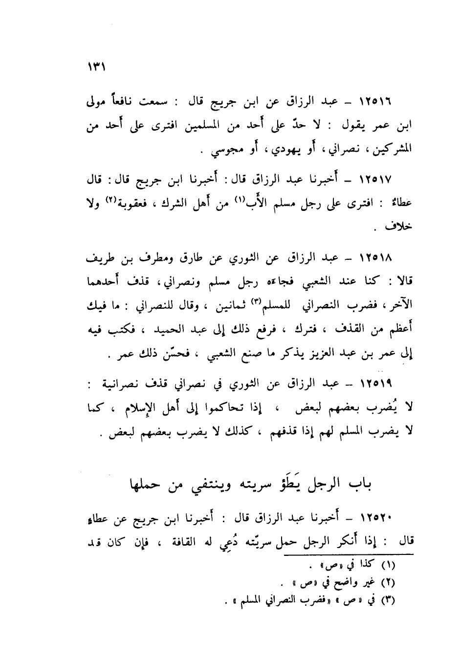 12517 - عَبْدُ الرَّزَّاقِ قَالَ: أَخْبَرَنَا ابْنُ جُرَيْجٍ قَالَ: قَالَ عَطَاءٌ: «§افْتَرَى عَلَى رَجُلٍ مُسْلِمٍ الْأَبُ مِنْ أَهْلِ الشِّرْكِ فَعُقُوبَةٌ وَلَا خِلَافَ»