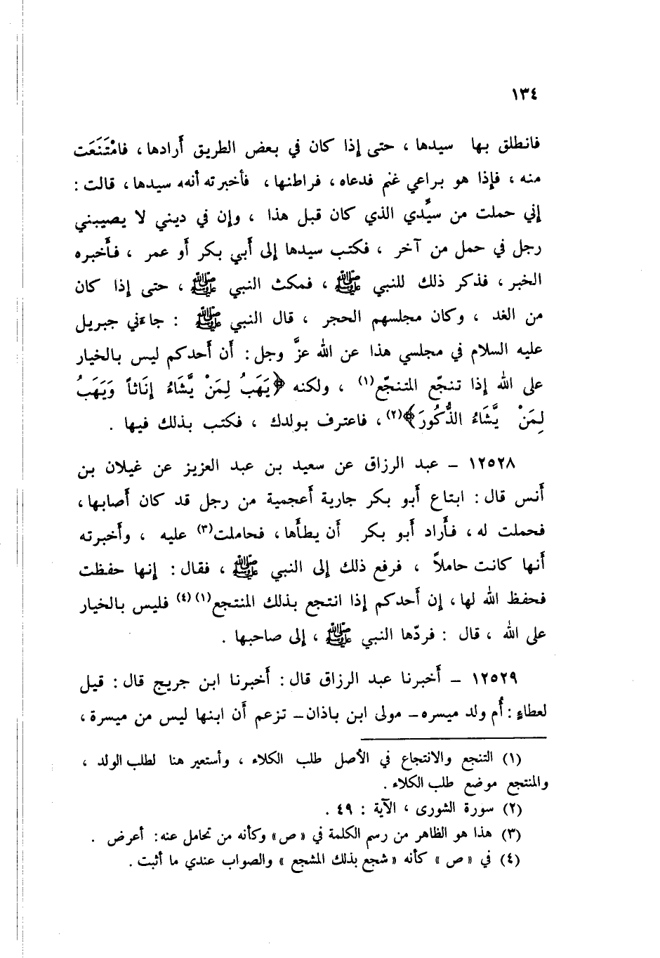 12528 - عَنْ سَعِيدِ بْنِ عَبْدِ الْعَزِيزِ، عَنْ غَيْلَانَ بْنِ أَنَسٍ قَالَ: ابْتَاعَ أَبُو بَكْرٍ جَارِيَةً أَعْجَمِيَّةً مِنْ رَجُلٍ قَدْ كَانَ أَصَابَهَا فَحَمَلَتْ لَهُ فَأَرَادَ أَبُو بَكْرٍ أَنْ يَطَأَهَا فَحَامَلَتْ عَلَيْهِ، وَأَخْبَرَتْهُ أَنَّهَا كَانَتْ حَامِلًا فَرَفَعَ ذَلِكَ إِلَى النَّبِيِّ صَلَّى اللهُ عَلَيْهِ وَسَلَّمَ فَقَالَ: «إِنَّهَا حَفِظَتْ فَحَفِظَ اللَّهُ لَهَا، إِنَّ §أَحَدَكُمْ إِذَا انْتَجَعَ بِذَلِكَ الْمُنْتَجَعِ فَلَيْسَ بِالْخِيَارِ عَلَى اللَّهِ» قَالَ: فَرَدَّهَا النَّبِيُّ صَلَّى اللهُ عَلَيْهِ وَسَلَّمَ إِلَى صَاحِبِهَا