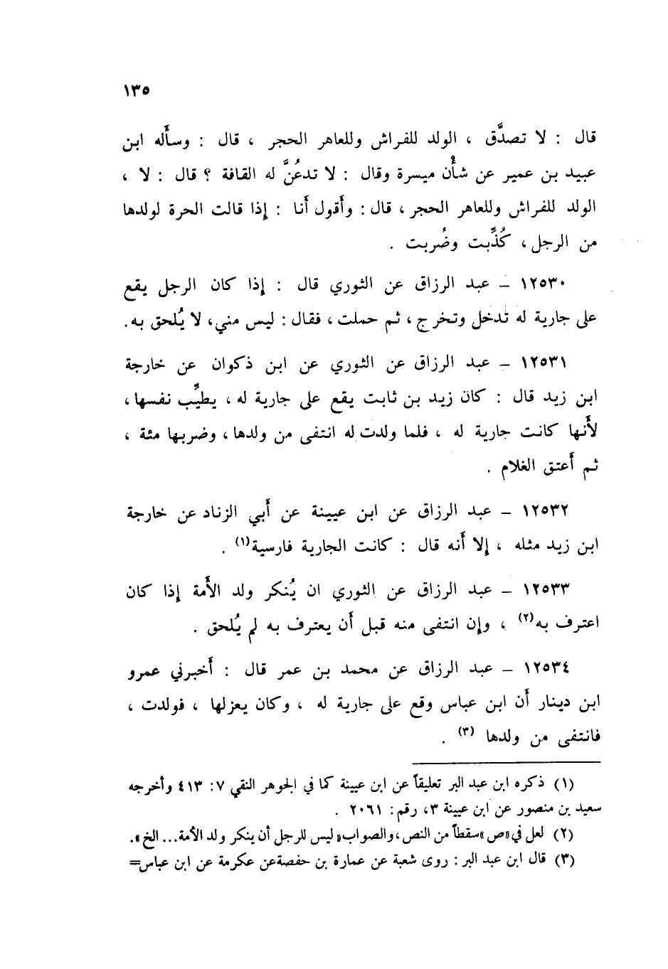 12531 - عَنِ الثَّوْرِيِّ، عَنِ ابْنِ ذَكْوَانَ، عَنْ خَارِجَةَ بْنِ زَيْدٍ قَالَ: كَانَ زَيْدُ بْنُ ثَابِتٍ §يَقَعُ عَلَى جَارِيَةٍ لَهُ يُطَيِّبُ نَفْسَهَا لِأَنَّهَا كَانَتْ جَارِيَةً لَهُ، فَلَمَّا وَلَدَتْ لَهُ انْتَفَى مِنْ وَلَدِهَا وَضَرَبَهَا مِائَةً، ثُمَّ أَعْتَقَ الْغُلَامَ ".