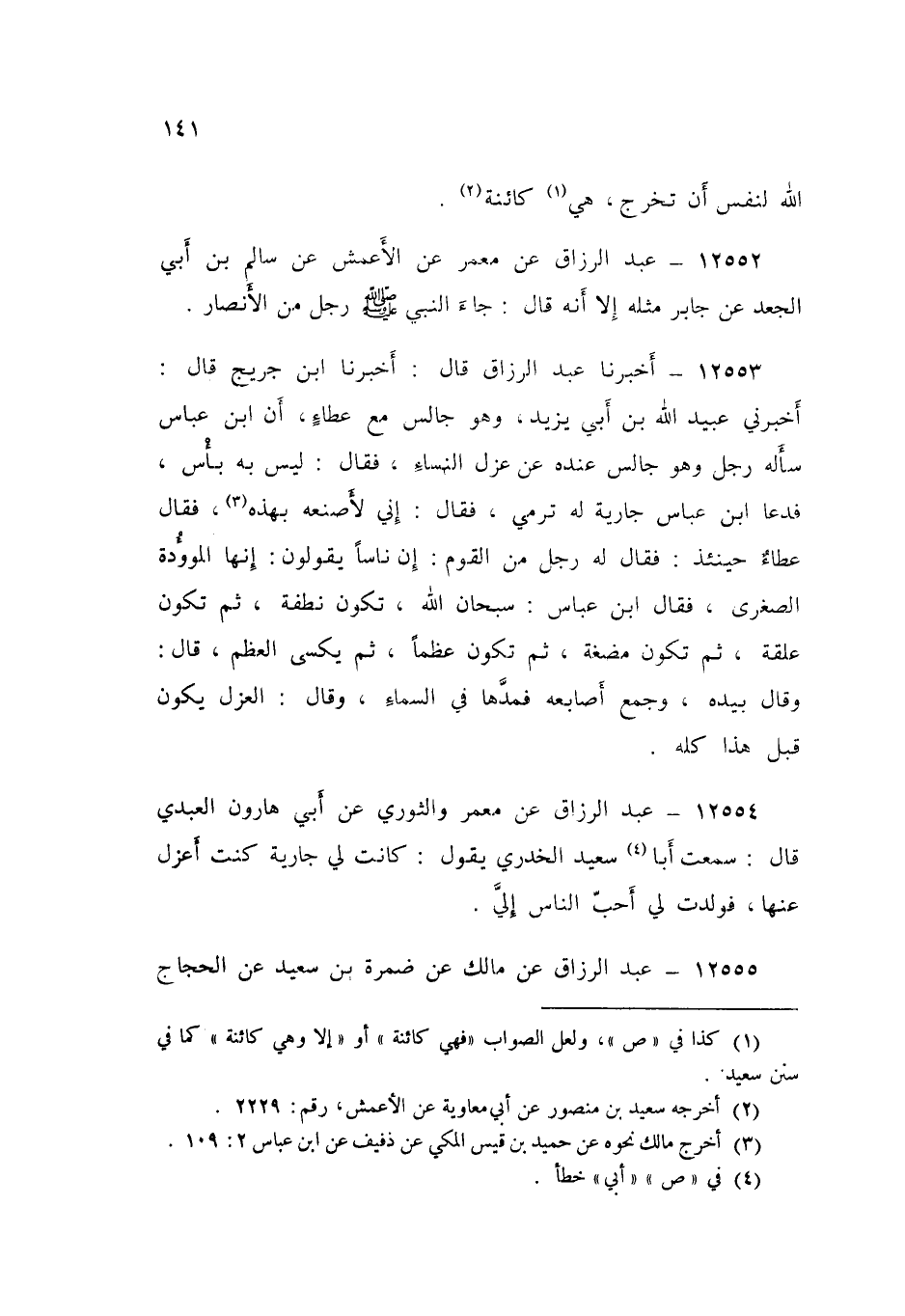 12553 - عَبْدُ الرَّزَّاقِ قَالَ: أَخْبَرَنَا ابْنُ جُرَيْجٍ قَالَ: أَخْبَرَنِي عُبَيْدُ اللَّهِ بْنُ أَبِي يَزِيدَ، وَهُوَ جَالِسٌ مَعَ عَطَاءٍ، أَنَّ ابْنَ عَبَّاسٍ سَأَلَهُ رَجُلٌ وَهُوَ جَالِسٌ عِنْدَهُ عَنْ عَزْلِ النِّسَاءِ، فَقَالَ: «لَيْسَ بِهِ بَأْسٌ»، فَدَعَا ابْنُ عَبَّاسٍ جَارِيَةً لَهُ تَرْمِي فَقَالَ: «إِنِّي لَأَصْنَعُهُ بِهَذِهِ» - فَقَالَ عَطَاءٌ حِينَئِذٍ - فَقَالَ لَهُ رَجُلٌ مِنَ الْقَوْمِ: إِنَّ نَاسًا يَقُولُونَ إِنَّهَا الْمَوْؤُدَةُ الصُّغْرَى. فَقَالَ ابْنُ عَبَّاسٍ: «§سُبْحَانَ اللَّهِ، تَكُونُ نُطْفَةً، ثُمَّ تَكُونُ عَلَقَةً، ثُمَّ تَكُونُ مُضْغَةً، ثُمَّ تَكُونُ عَظْمًا، ثُمَّ يُكْسَى الْعَظْمُ» قَالَ: وَقَالَ بِيدِهِ وَجَمَعَ أَصَابِعَهُ فَمَدَّهَا فِي السَّمَاءِ وَقَالَ: «الْعَزْلُ يَكُونُ قَبْلَ هَذَا كُلِّهِ»