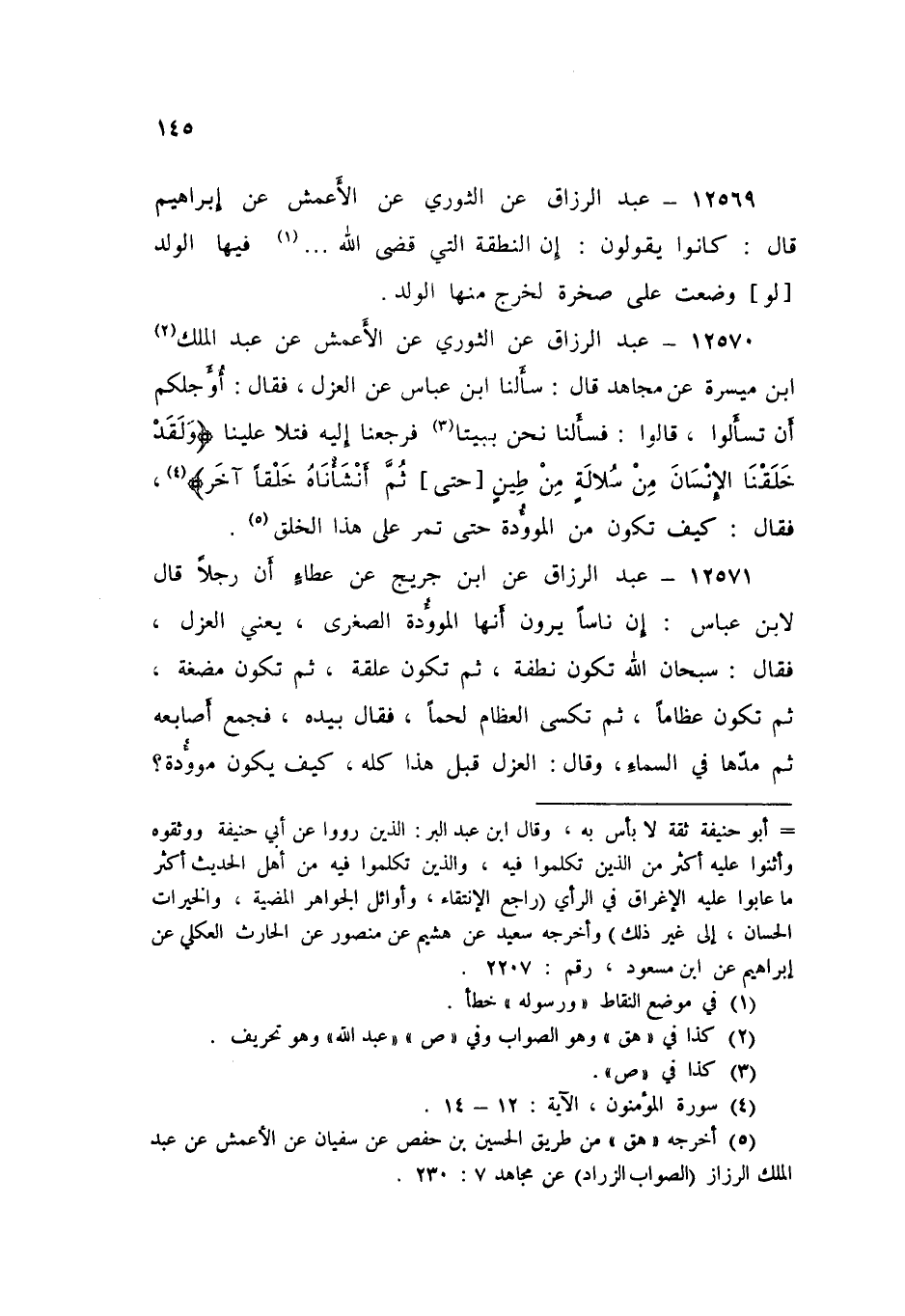 12571 - عَنِ ابْنِ جُرَيْجٍ، عَنْ عَطَاءٍ، أَنَّ رَجُلًا، قَالَ لَابْنِ عَبَّاسٍ: إِنَّ نَاسًا يَرَوْنَ أَنَّهَا الْمَوْؤُدَةُ الصُّغْرَى - يَعْنِي الْعَزْلَ - فَقَالَ: «§سُبْحَانَ اللَّهِ، تَكُونُ نُطْفَةً، ثُمَّ تَكُونُ عَلَقَةً، ثُمَّ تَكُونُ مُضْغَةً، ثُمَّ تَكُونُ عِظَامًا، ثُمَّ تُكْسَى الْعِظَامُ لَحْمًا» فَقَالَ بِيَدِهِ: فَجَمَعَ أَصَابِعَهُ ثُمَّ مَدَّهَا فِي السَّمَاءِ، وَقَالَ: «الْعَزْلُ قَبْلَ هَذَا كُلِّهِ، كَيْفَ يَكُونُ مَوْءُودَةً، ثُمَّ يُنْفَخُ فِيهِ الرُّوحُ فَيَكُونُ الْعَزْلُ قَبْلَ هَذَا كُلِّهِ»