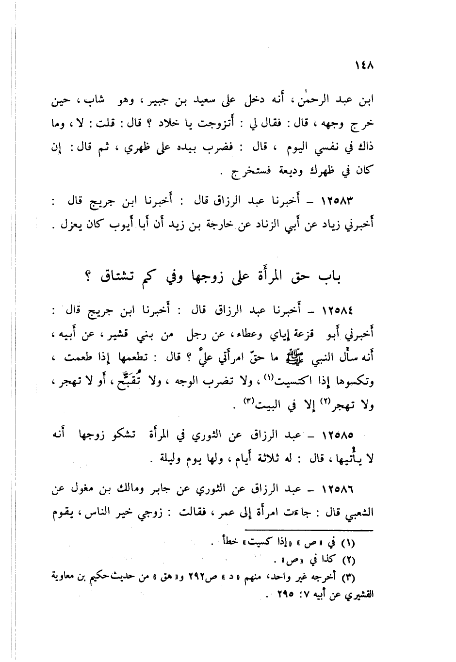 12584 - عَبْدُ الرَّزَّاقِ قَالَ: أَخْبَرَنَا ابْنُ جُرَيْجٍ قَالَ: أَخْبَرَنِي أَبُو قَزَعَةَ، إِيَّايَ وَعَطَاءٌ، عَنْ رَجُلٍ مِنْ بَنِي قُشَيْرٍ، عَنِ أَبِيهِ، أَنَّهُ سَأَلَ النَّبِيَّ صَلَّى اللهُ عَلَيْهِ وَسَلَّمَ: مَا حَقُّ امْرَأَتِي عَلَيَّ؟ قَالُ: «§تُطْعِمُهَا إِذَا طَعِمْتَ، وَتَكْسُوهَا إِذَا اكْتَسَيْتَ، وَلَا تَضْرِبِ الْوَجْهَ، وَلَا تُقَبِّحْ - أَوْ لَا تَهْجُرْ -، وَلَا تَهْجُرْ إِلَّا فِي الْبَيْتِ»