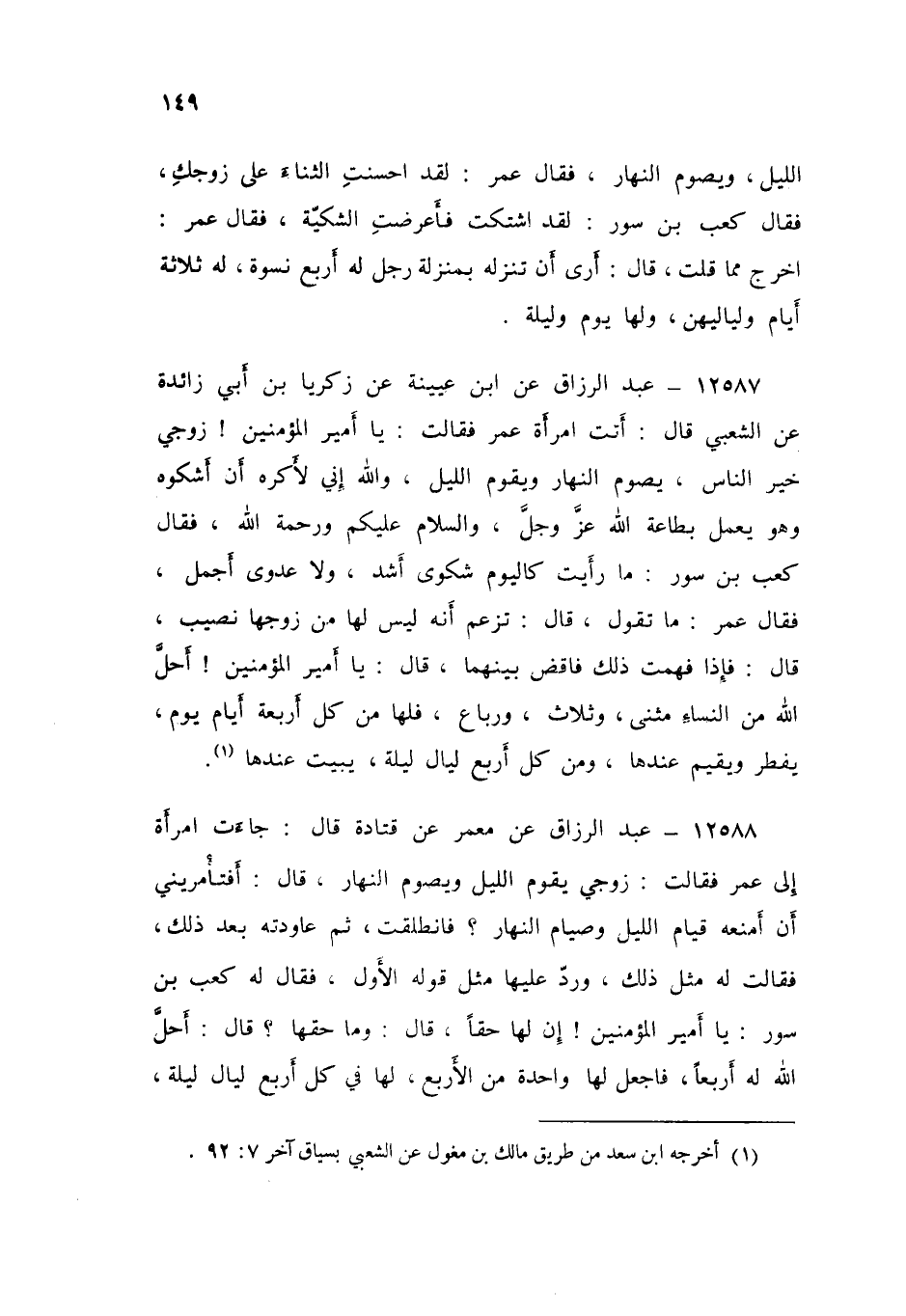 12588 - عَنْ مَعْمَرٍ، عَنْ قَتَادَةَ قَالَ: جَاءَتِ امْرَأَةٌ إِلَى عُمَرَ، فَقَالَتْ: زَوْجِي يَقُومُ اللَّيْلَ، وَيَصُومُ النَّهَارَ. قَالَ: «أَفَتَأْمُرِينِي أَنْ أَمْنَعَهُ قِيَامَ اللَّيْلِ وَصِيَامَ النَّهَارِ؟» فَانْطَلَقَتْ، ثُمَّ عَاوَدَتْهُ بَعْدَ ذَلِكَ، فَقَالَتْ لَهُ: مِثْلَ ذَلِكَ وَرَدَّ عَلَيْهَا مِثْلَ قَوْلِهِ الْأَوَّلِ، فَقَالَ لَهُ كَعْبُ بْنُ سُورٍ يَا أَمِيرَ الْمُؤْمِنِينَ: إِنَّ لَهَا حَقًّا. قَالَ: «وَمَا حَقُّهَا؟» قَالَ: أَحَلَّ اللَّهُ لَهُ أَرْبَعًا فَاجْعَلْ لَهَا وَاحِدَةً مِنَ الْأَرْبَعِ لَهَا فِي كُلِّ أَرْبَعِ لَيَالٍ لَيْلَةً، وَفِي أَرْبَعَةِ أَيَّامٍ يَوْمًا قَالَ: فَدَعَا عُمَرُ زَوْجَهَا، §وَأَمَرَهُ أَنْ يَبِيتَ مَعَهَا مِنْ كُلِّ أَرْبَعِ لَيَالٍ لَيْلَةً، وَيُفْطِرَ مِنْ كُلِّ أَرْبَعَةِ أَيَّامٍ يَوْمًا