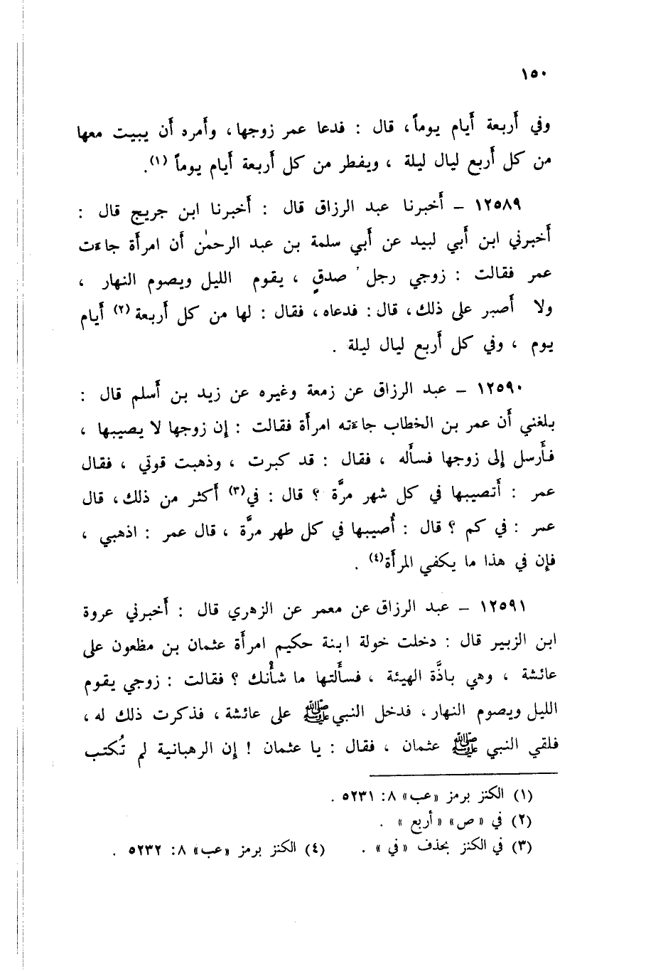 12590 - عَنْ زَمْعَةَ، وَغَيْرِهِ، عَنْ زَيْدِ بْنِ أَسْلَمَ قَالَ: بَلَغَنِي، أَنَّ عُمَرَ بْنَ الْخَطَّابِ، جَاءَتْهُ امْرَأَةٌ فَقَالَتْ: إِنَّ زَوْجَهَا لَا يُصِيبُهَا فَأَرْسَلَ إِلَى زَوْجِهَا فَسَأَلَهُ فَقَالَ: قَدْ كَبِرْتُ، وَذَهَبَتْ قُوتِي. فَقَالَ عُمَرُ: «أَتُصِيبُهَا فِي كُلِّ شَهْرٍ مَرَّةً؟» قَالَ: فِي أَكْثَرِ مِنْ ذَلِكَ، قَالَ عُمَرُ: «فِي كَمْ؟» قَالَ: أُصِيبُهَا فِي كُلِّ طُهْرٍ مَرَّةً، قَالَ عُمَرُ: «اذْهَبِي فَإِنَّ فِي §هَذَا مَا يَكْفِي الْمَرْأَةَ»