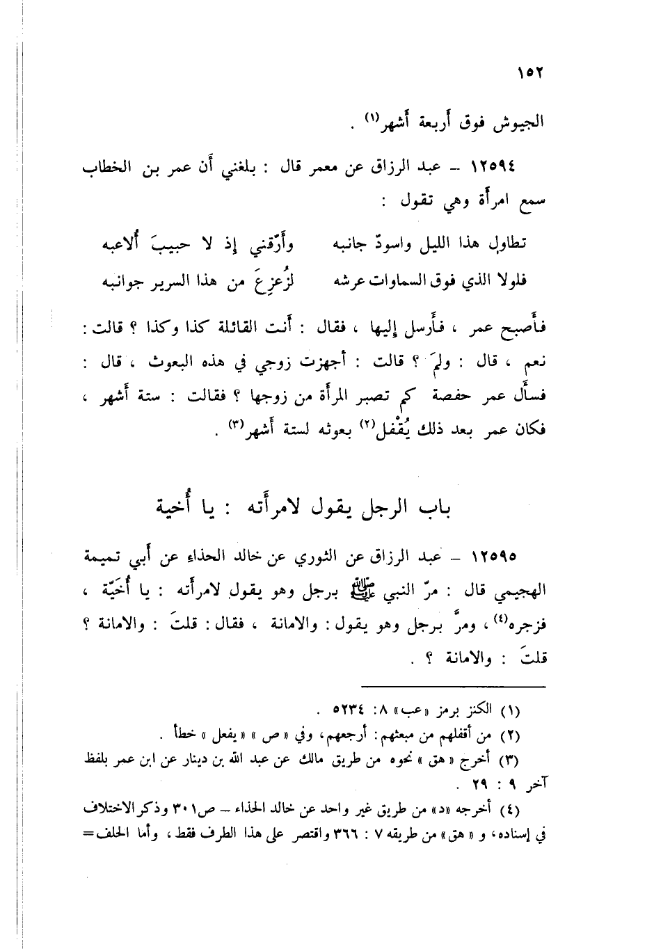 12595 - عَنِ الثَّوْرِيِّ، عَنْ خَالِدٍ الْحَذَّاءِ، عَنْ أَبِي تَمِيمَةَ الْهُجَيْمِيِّ، قَالُ: " §مَرَّ النَّبِيُّ صَلَّى اللهُ عَلَيْهِ وَسَلَّمَ بِرَجُلٍ وَهُوَ يَقُولُ لَامْرَأَتِهِ: يَا أُخَيَّةُ، فَزَجَرَهُ وَمَرَّ بِرَجُلٍ وَهُوَ يَقُولُ: وَالْأَمَانَةِ فَقَالَ: قُلْتَ: وَالْأَمَانَةِ، قُلْتَ: «وَالْأَمَانَةِ»