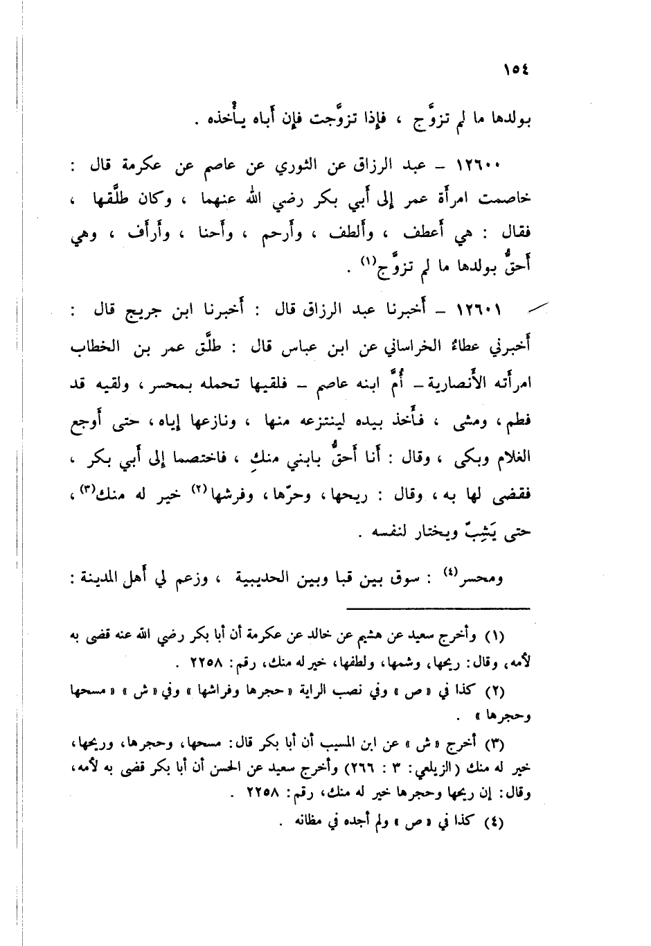 12601 - عَبْدُ الرَّزَّاقِ قَالَ: أَخْبَرَنَا ابْنُ جُرَيْجٍ قَالَ: أَخْبَرَنِي عَطَاءٌ الْخُرَاسَانِيُّ، عَنِ ابْنِ عَبَّاسٍ قَالَ: طَلَّقَ عُمَرُ بْنُ الْخَطَّابِ امْرَأَتَهُ الْأَنْصَارِيَّةَ أُمَّ ابْنِهِ عَاصِمٍ فَلَقِيهَا تَحْمِلُهُ بِمَحْسَرٍ، وَلَقِيَهُ قَدْ فُطِمَ وَمَشَى، فَأَخَذَ بِيَدِهِ لِيَنْتَزِعَهُ مِنْهَا وَنَازَعَهَا إِيَّاهُ حَتَّى أَوْجَعَ الْغُلَامَ وَبَكَى، وَقَالَ: أَنَا أَحَقُّ بِابْنِي مِنْكِ فَاخْتَصَمَا إِلَى أَبِي بَكْرٍ فَقَضَى لَهَا بِهِ، وَقَالَ: " §رِيحُهَا وَحَرُّهَا وَفَرْشُهَا خَيْرٌ لَهُ مِنْكَ حَتَّى يَشِبَّ وَيَخْتَارَ لِنَفْسِهِ - وَمَحْسَرٌ: سُوقٌ بَيْنَ قُبَا وَبَيْنَ الْحُدَيْبِيَةِ -، وَزَعَمَ لِي أَهْلُ الْمَدِينَةِ -[155]- إِنَّمَا لَقِيَ جَدَّتَهُ الشَّمُوسَ تَحْمِلُهُ بِمَحْسَرٍ "