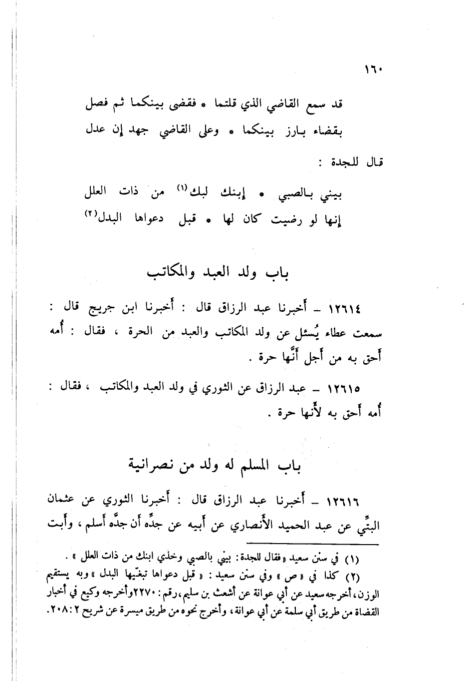12614 - عَبْدُ الرَّزَّاقِ، أَخْبَرَنَا ابْنُ جُرَيْجٍ قَالَ: سَمِعْتُ عَطَاءً، يُسْأَلُ عَنْ وَلَدِ الْمُكَاتَبِ، وَالعَبْدِ مِنَ الْحُرَّةِ فَقَالَ: «§أُمُّهُ أَحَقُّ بِهِ مِنْ أَجْلِ أَنَّهَا حُرَّةٌ»