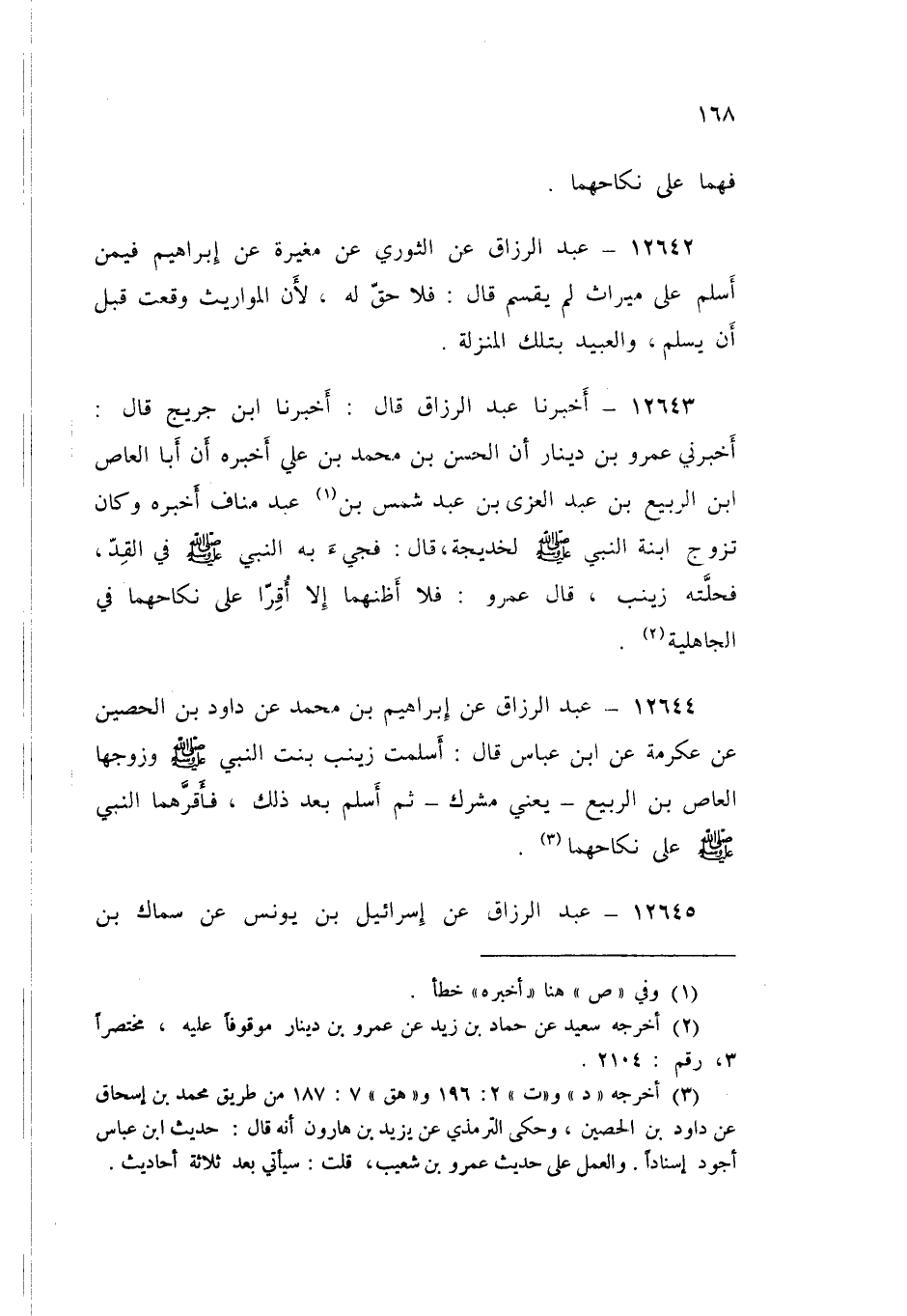 12643 - عَبْدُ الرَّزَّاقِ قَالَ: أَخْبَرَنَا ابْنُ جُرَيْجٍ قَالَ: أَخْبَرَنِي عَمْرُو بْنُ دِينَارٍ، أَنَّ الْحَسَنَ بْنَ مُحَمَّدِ بْنِ عَلِيٍّ، أَخْبَرَهُ، أَنَّ أَبَا الْعَاصِ بْنَ الرَّبِيعِ بْنِ عَبْدِ الْعُزَّى بْنِ عَبْدِ شَمْسِ بْنِ عَبْدِ مَنَافٍ، أَخْبَرَهُ، وَكَانَ تَزَوَّجَ ابْنَةَ النَّبِيِّ صَلَّى اللهُ عَلَيْهِ وَسَلَّمَ لِخَدِيجَةِ قَالَ: «§فَجِيءَ بِهِ النَّبِيَّ صَلَّى اللهُ عَلَيْهِ وَسَلَّمَ فِي الْقِدِّ، فَحَلَّتْهُ زَيْنَبُ» قَالَ عَمْرٌو: «فَلَا أَظُنَّهُمَا إِلَّا أَقَرَّا عَلَى نِكَاحِهِمَا فِي الْجَاهِلِيَّةِ»