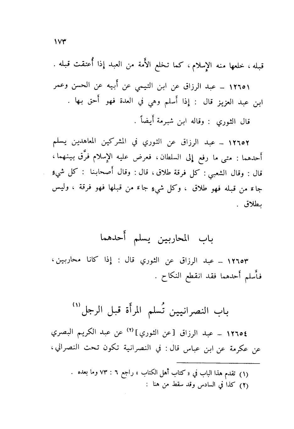 12653 - عَنِ الثَّوْرِيِّ قَالَ: «§إِذَا كَانَا مُحَارِبَيْنِ فَأَسْلَمَ أَحَدُهُمَا فَقَدِ انْقَطَعَ النِّكَاحُ»
