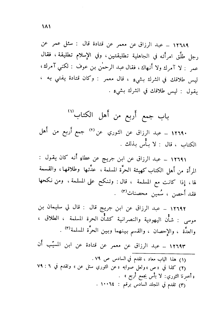 12692 - عَنِ ابْنِ جُرَيْجٍ قَالَ: قَالَ لِي سُلَيْمَانُ بْنُ مُوسَى: «§شَأْنُ الْيَهُودِيَّةِ وَالنَّصْرَانِيَّةِ، كَشَأْنِ الْحُرَّةِ الْمُسْلِمَةِ الطَّلَاقُ وَالعِدَّةُ وَالْإِحْصَانُ، وَالقَسْمُ بَيْنَهُمَا وَبَيْنَ الْحُرَّةِ الْمُسْلِمَةِ»