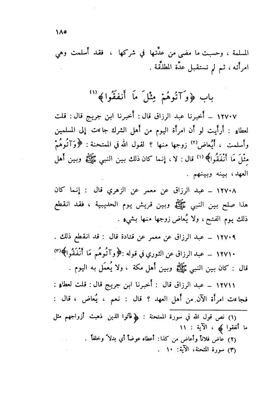 12707 - أَخْبَرَنَا عَبْدُ الرَّزَّاقِ قَالَ: أَخْبَرَنَا ابْنُ جُرَيْجٍ قَالَ: قُلْتُ لِعَطَاءٍ: §أَرَأَيْتَ لَوْ أَنَّ امْرَأَةً الْيَوْمَ مِنْ أَهْلِ الشِّرْكِ جَاءَتْ إِلَى الْمُسْلِمَيْنَ وَأَسْلَمَتْ أَيُعَاضُ زَوْجُهَا مِنْهَا لِقَوْلِ اللَّهِ فِي الْمُمْتَحَنَةِ: {وَآتُوهُمْ مثل مَا أَنْفَقُوا}؟ قَالَ: «لَا، إِنَّمَا كَانَ ذَلِكَ بَيْنَ النَّبِيِّ صَلَّى اللهُ عَلَيْهِ وَسَلَّمَ وَبَيْنَ أَهْلِ الْعَهْدِ بَيْنَهُ وَبَيْنَهُمْ»