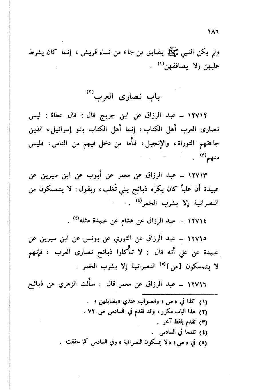12712 - عَنِ ابْنِ جُرَيْجٍ قَالَ: قَالَ عَطَاءٌ: «§لَيْسَ نَصَارَى الْعَرَبِ أَهْلَ الْكِتَابِ، إِنَّمَا أَهْلُ الْكِتَابِ بَنُو إِسْرَائِيلَ الَّذِينَ جَاءَتْهُمُ التَّوْرَاةُ وَالْإِنْجِيلُ، فَأَمَّا مَنْ دَخَلَ فِيهِمْ مِنَ النَّاسِ فَلَيْسَ مِنْهُمْ»